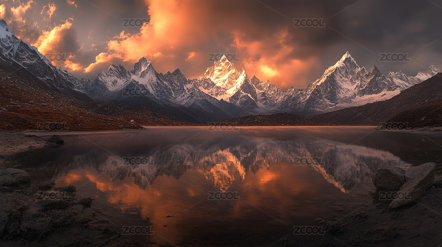 日落时的雪山倒影