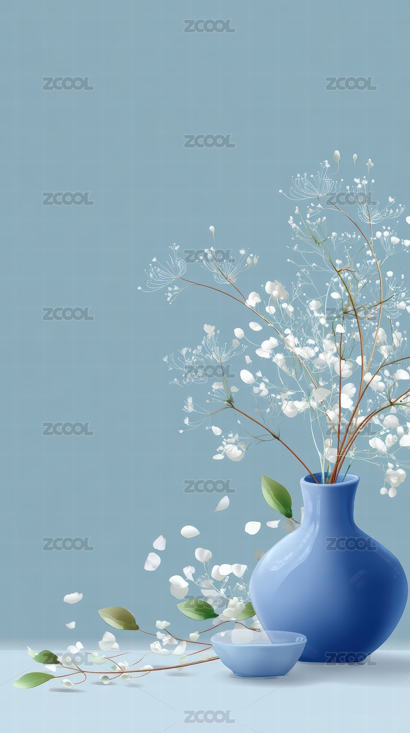 蓝色花瓶中绽放的梦幻花枝