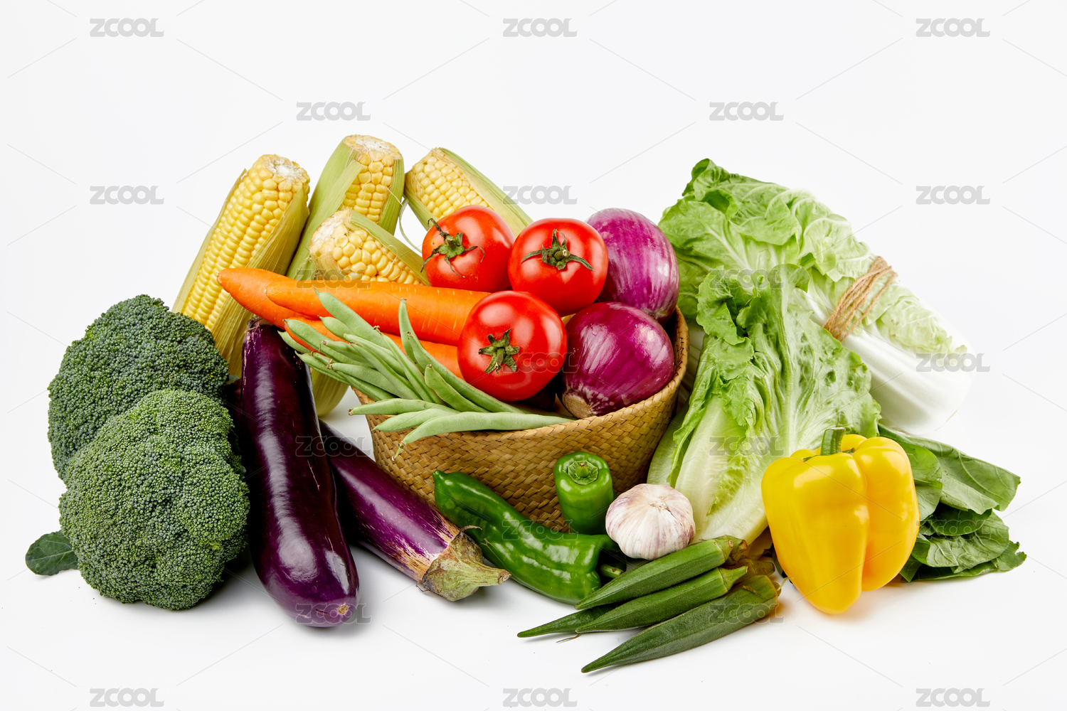 白色背景里摆放着各种各样新鲜的水果蔬菜