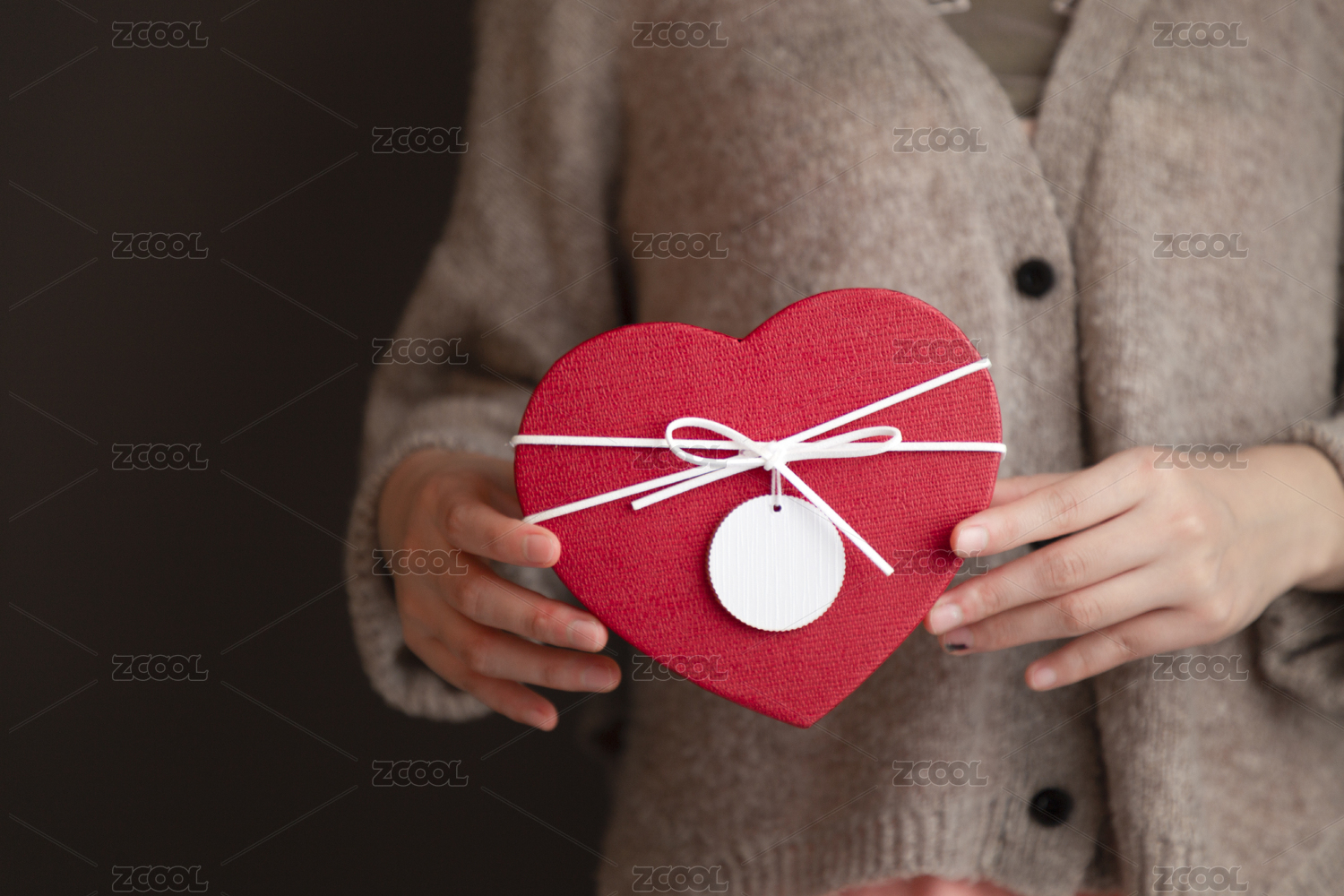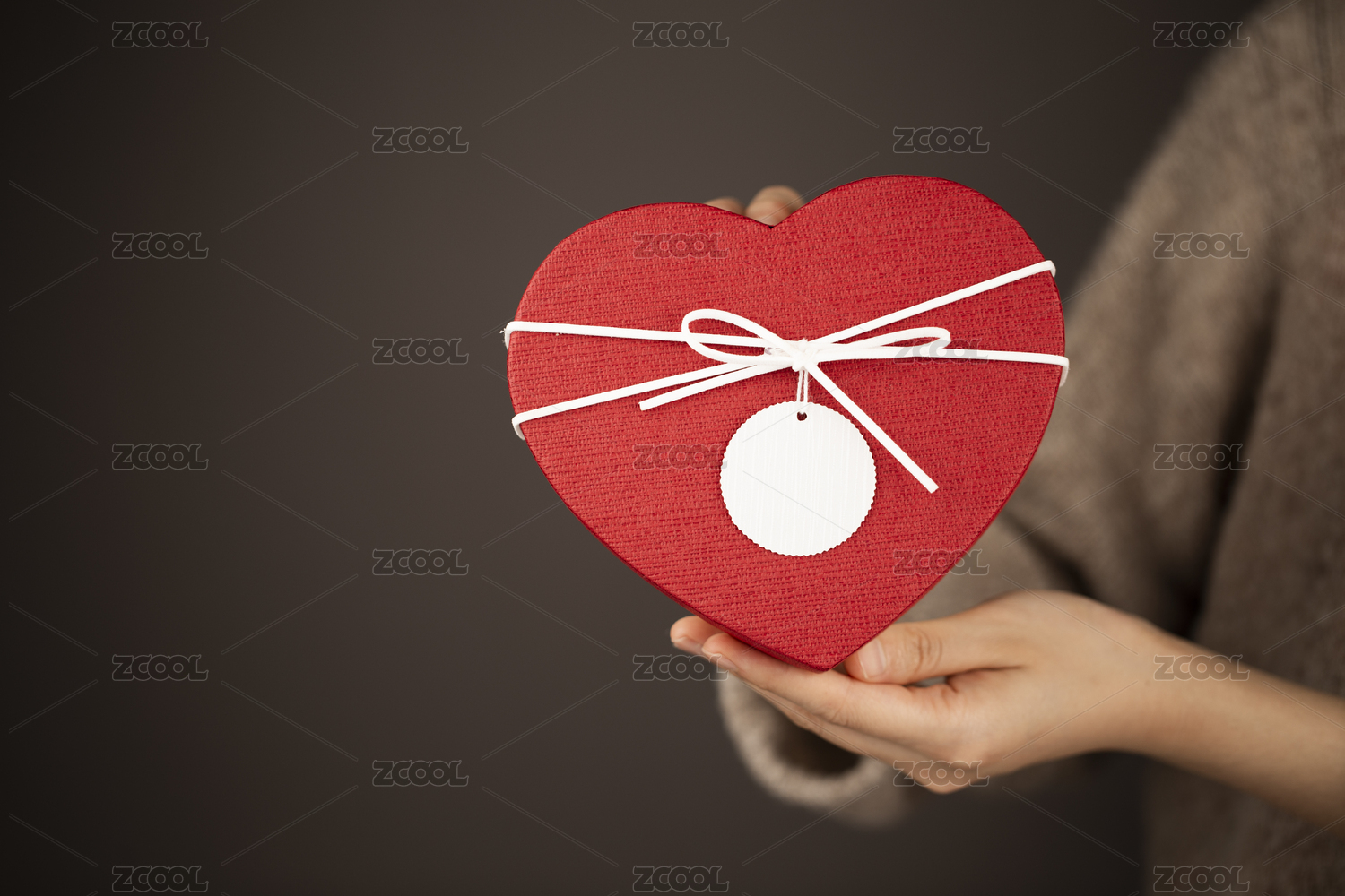 圣诞节节日白色背景下一个穿着红色圣诞节服装的中国亚洲美女女人拿着一个爱心心形的礼物礼盒送给爱人充满了惊喜与快乐幸福表达爱与感谢与祝福