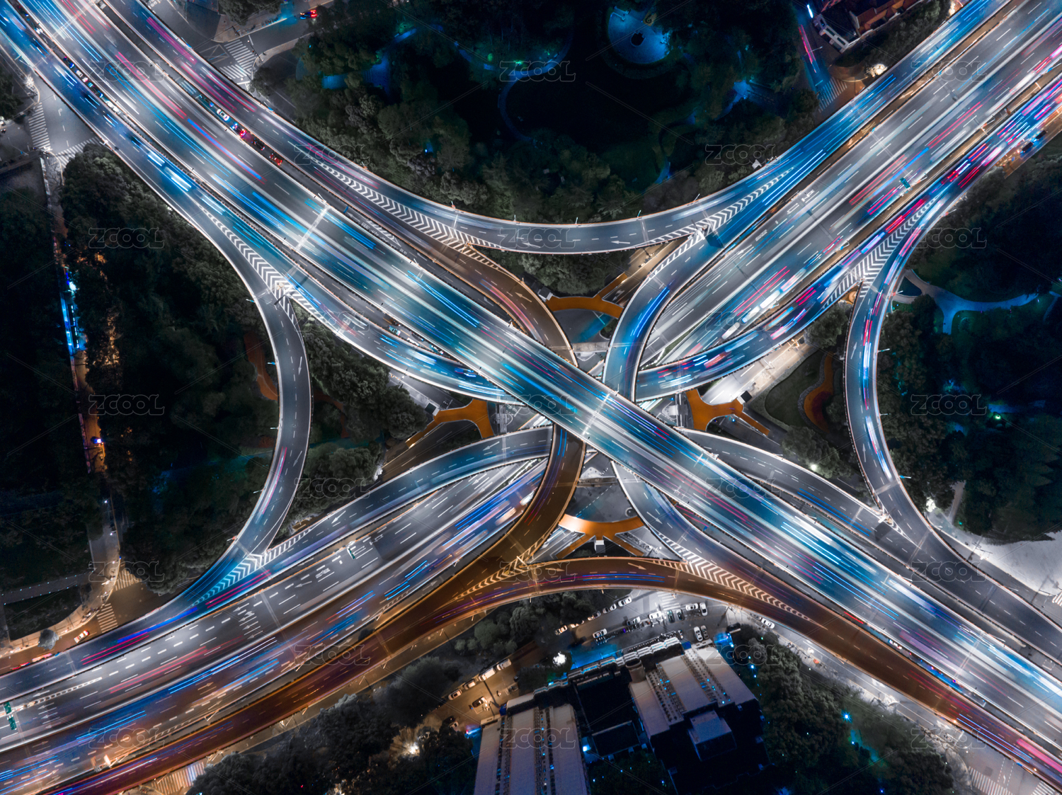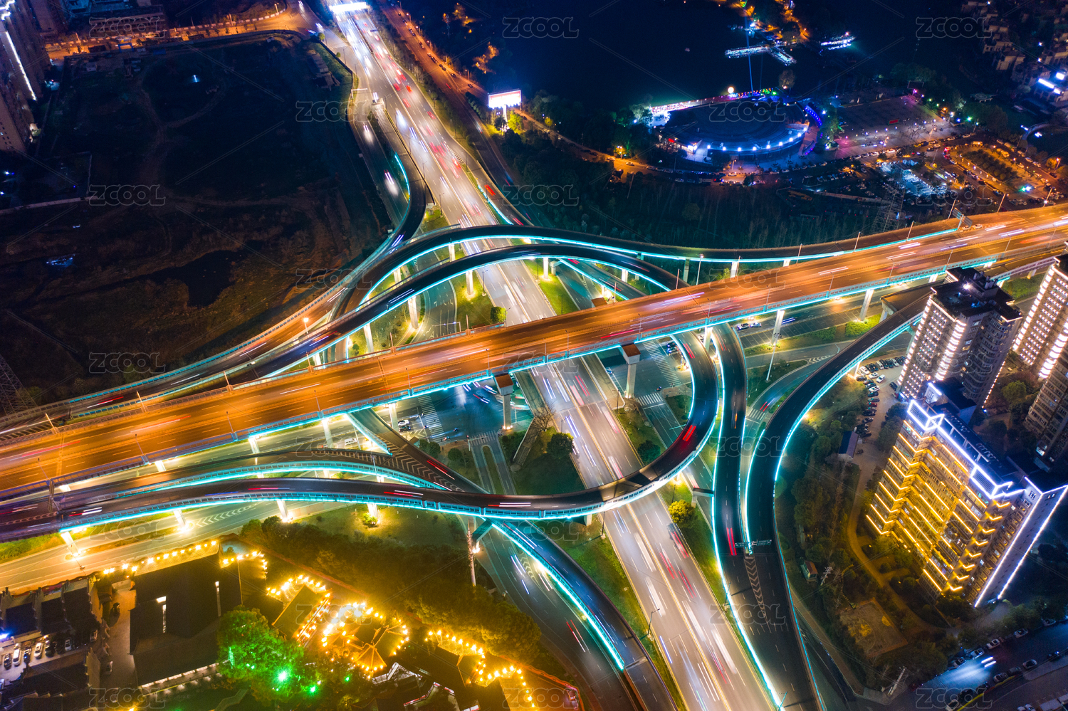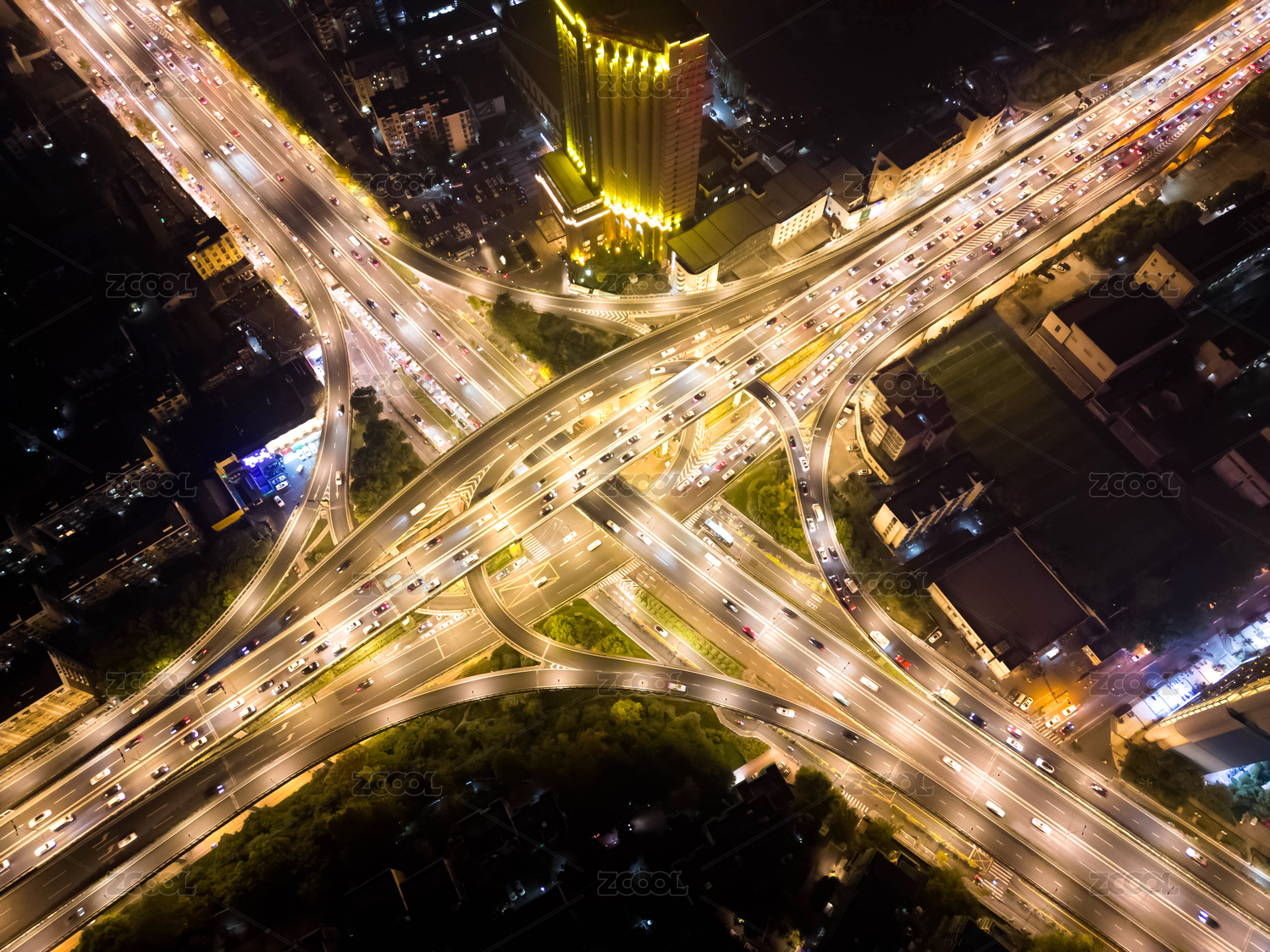高空视角下的圆形高架桥车流 夜景繁忙交通