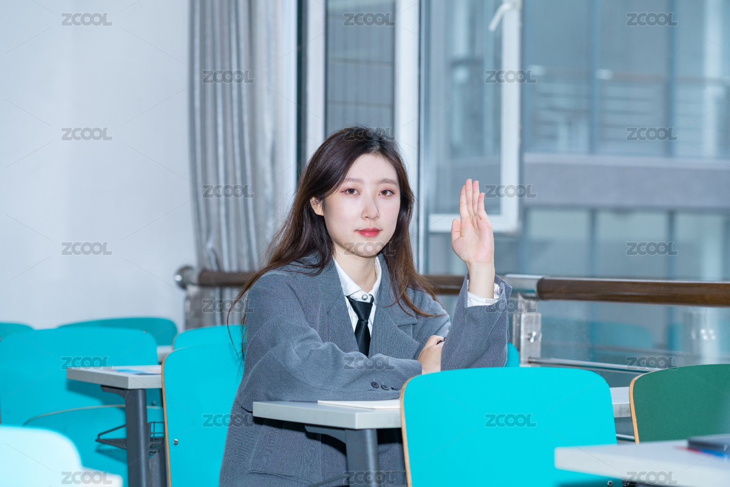 中国美女大学生在教室内认真上课举起手提出回答问题