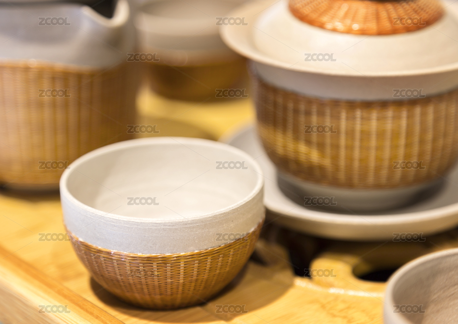桌面上摆放的带有藤编保护套的瓷器茶具