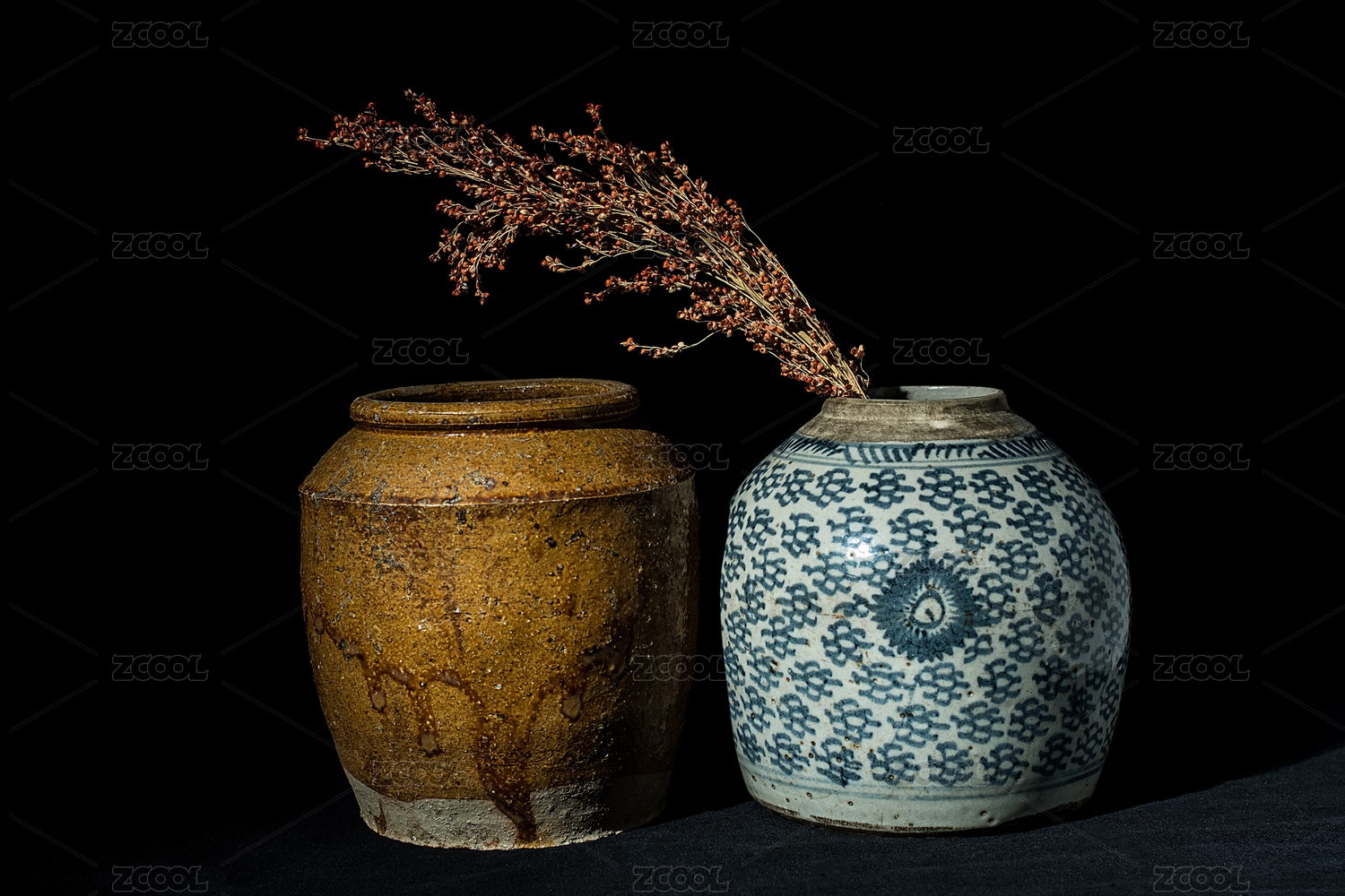 灰色背景的褐色土陶花瓶和青花瓷茶具