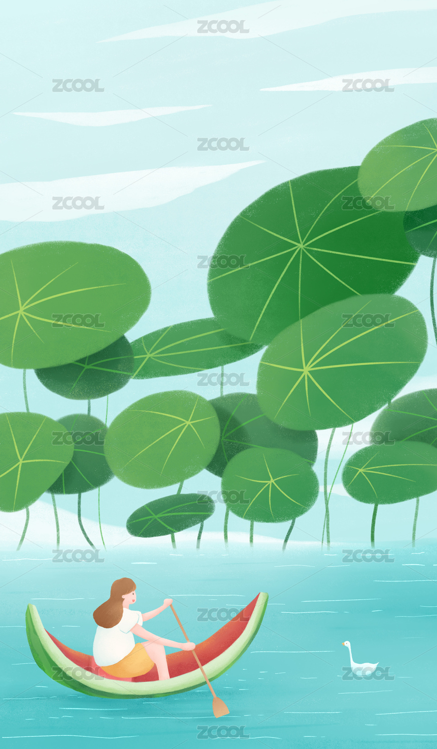 女孩乘坐西瓜船在湖里玩耍 大暑插画