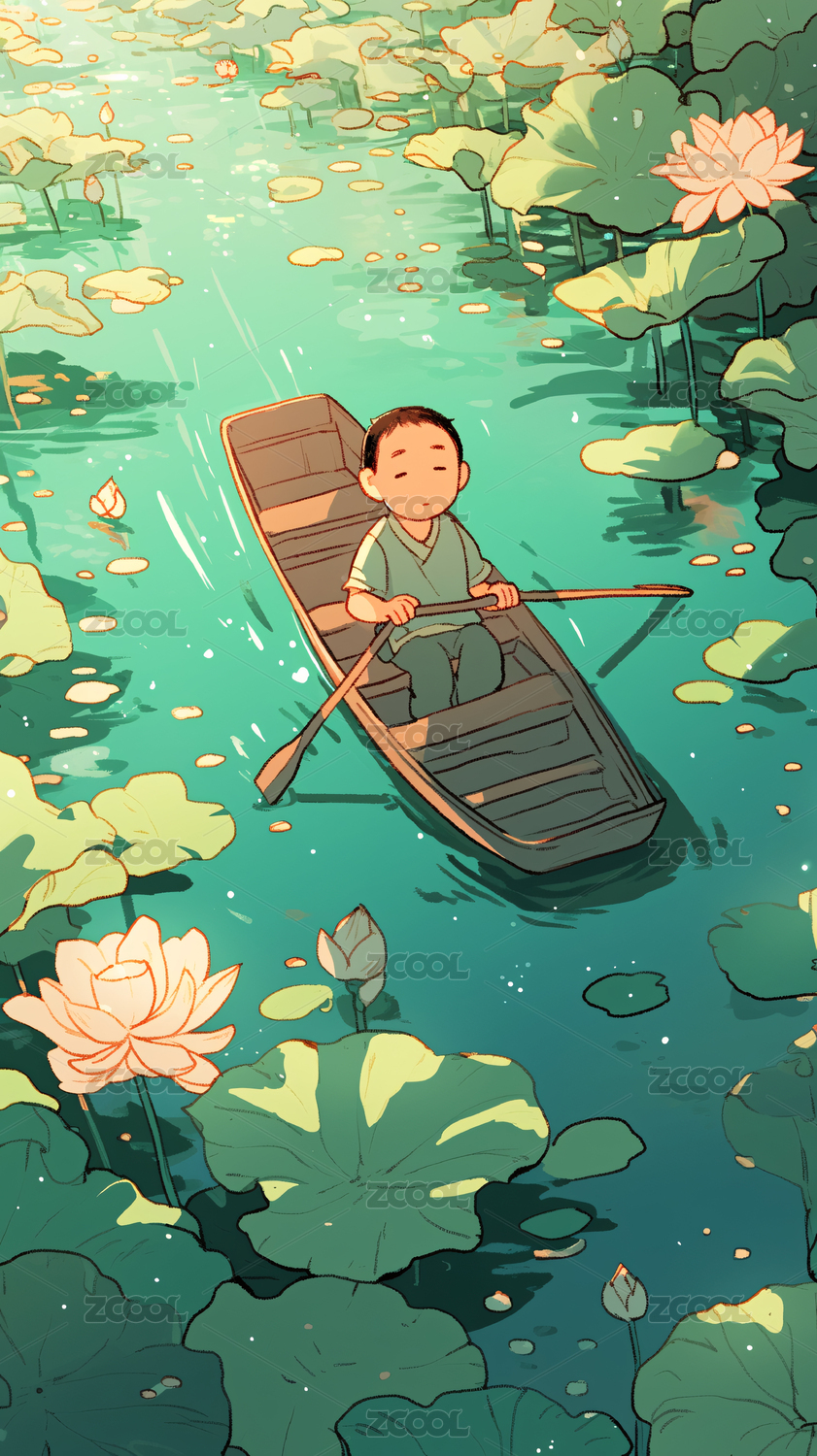 夏天立夏一个小孩在荷花池中划船唯美插画