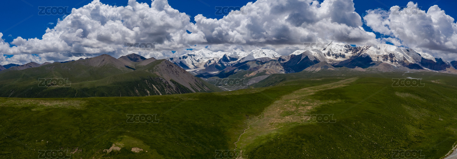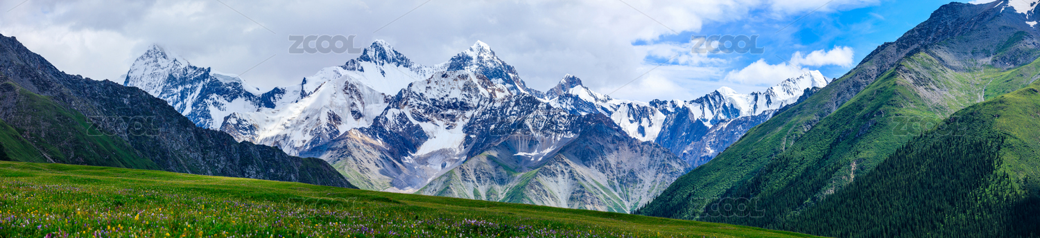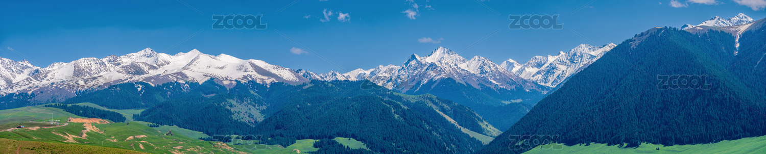 中国新疆下塔风景区雄伟的山脉和绿色的草原