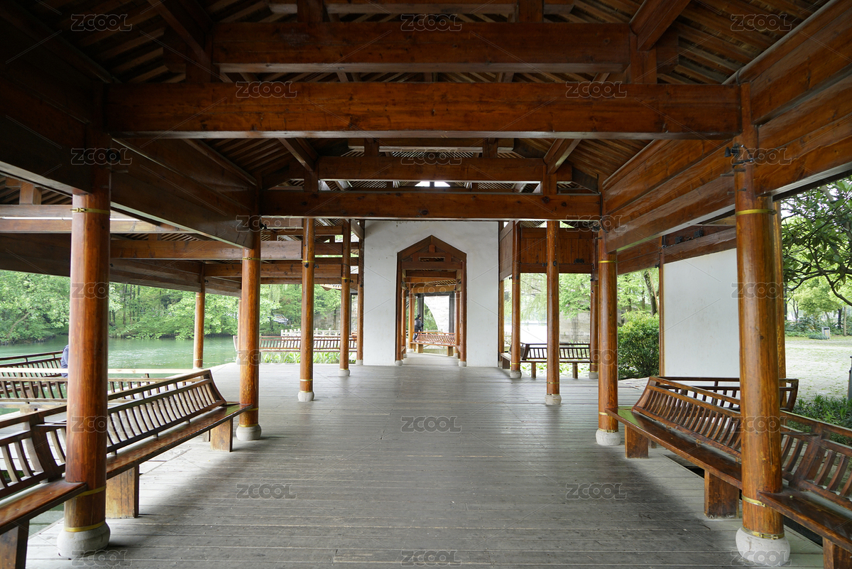 中国浙江杭州西湖景区,中式建筑走廊江南园林景观