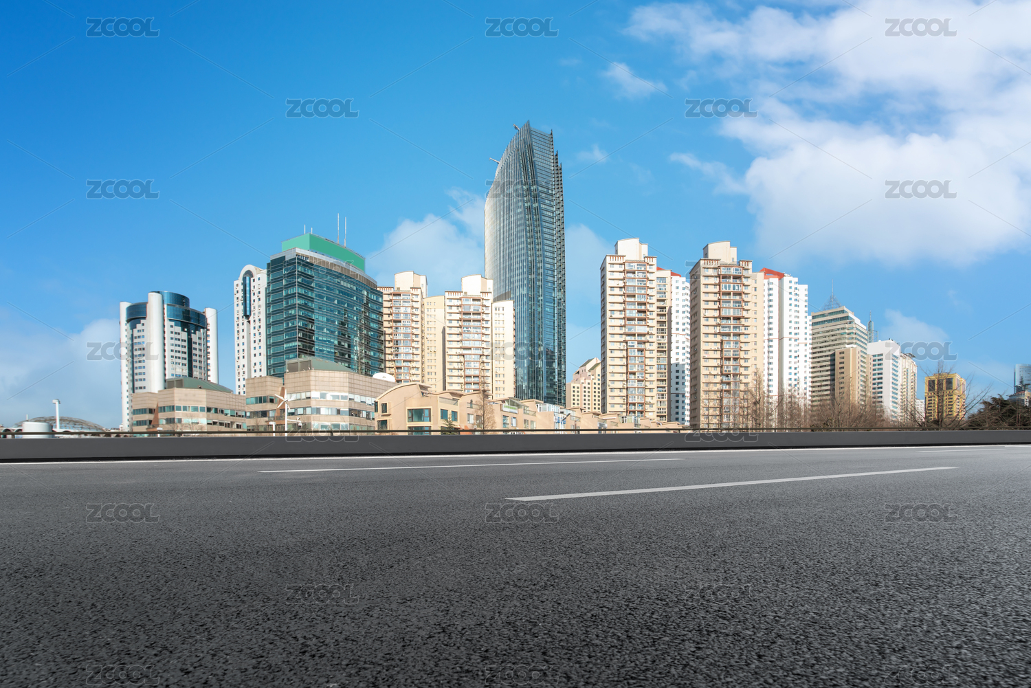 中国武汉空旷的柏油路与现代城市建筑天际线全景