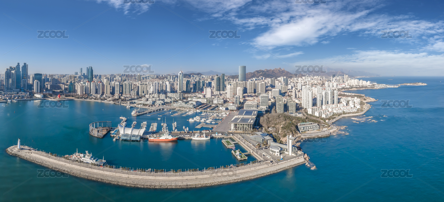 中国山东青岛奥帆中心和情人坝清晨俯瞰航拍