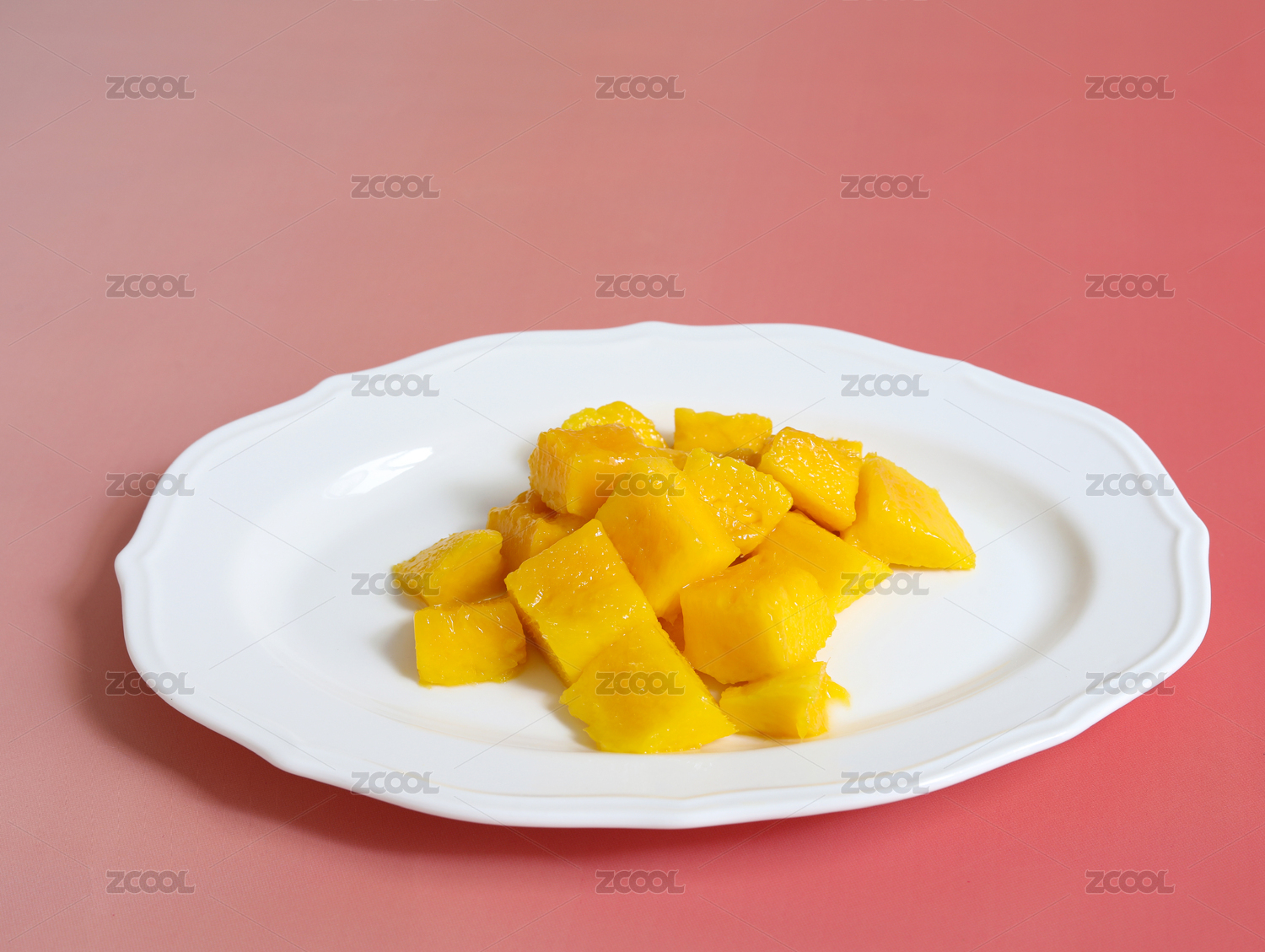 一碟子切开的新鲜热带水果芒果果肉下午茶
