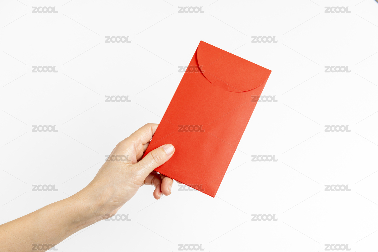 发红包手拿红包特写白色背景