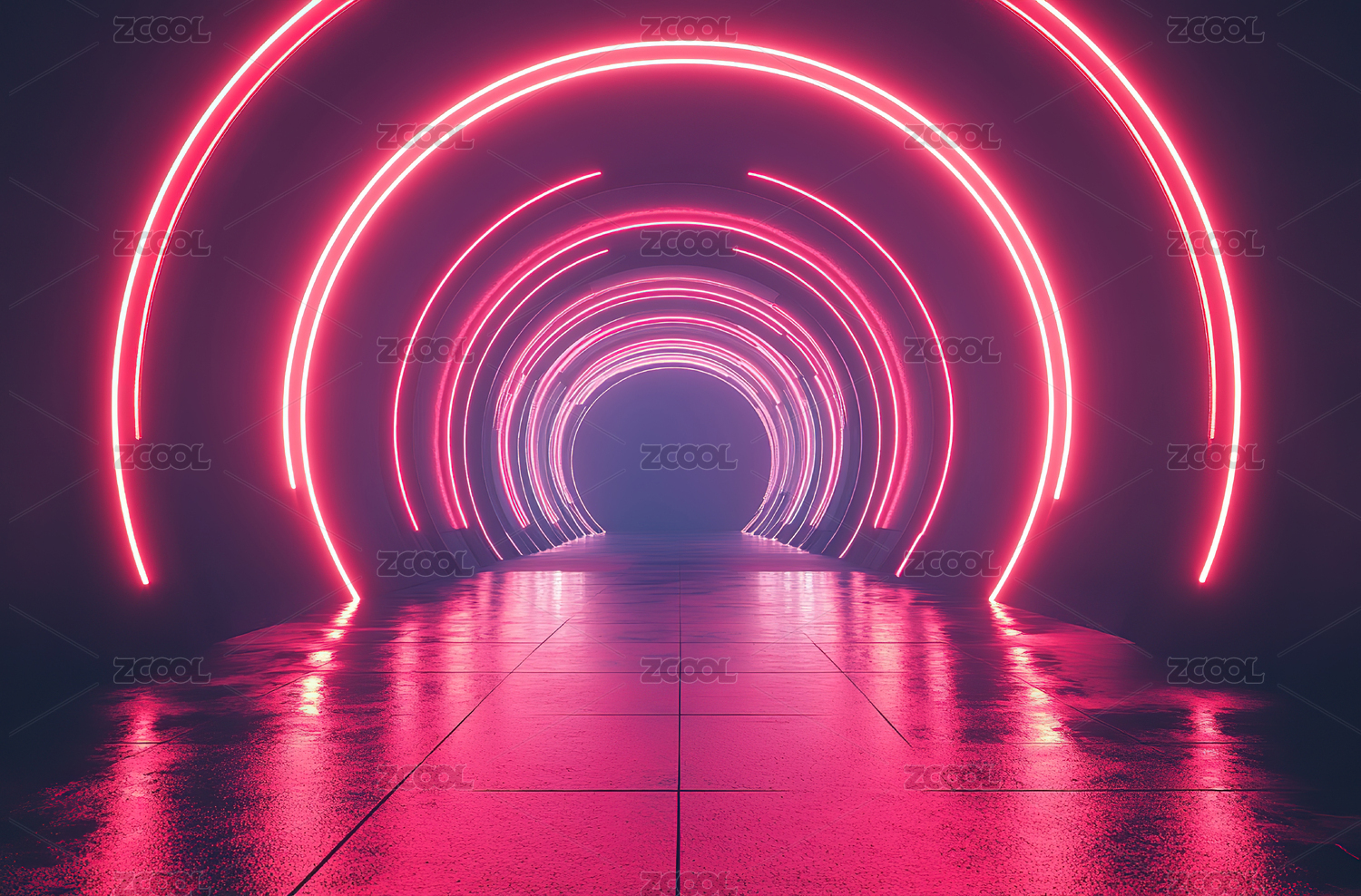 三维渲染蓝紫色霓虹灯拱门室内空间