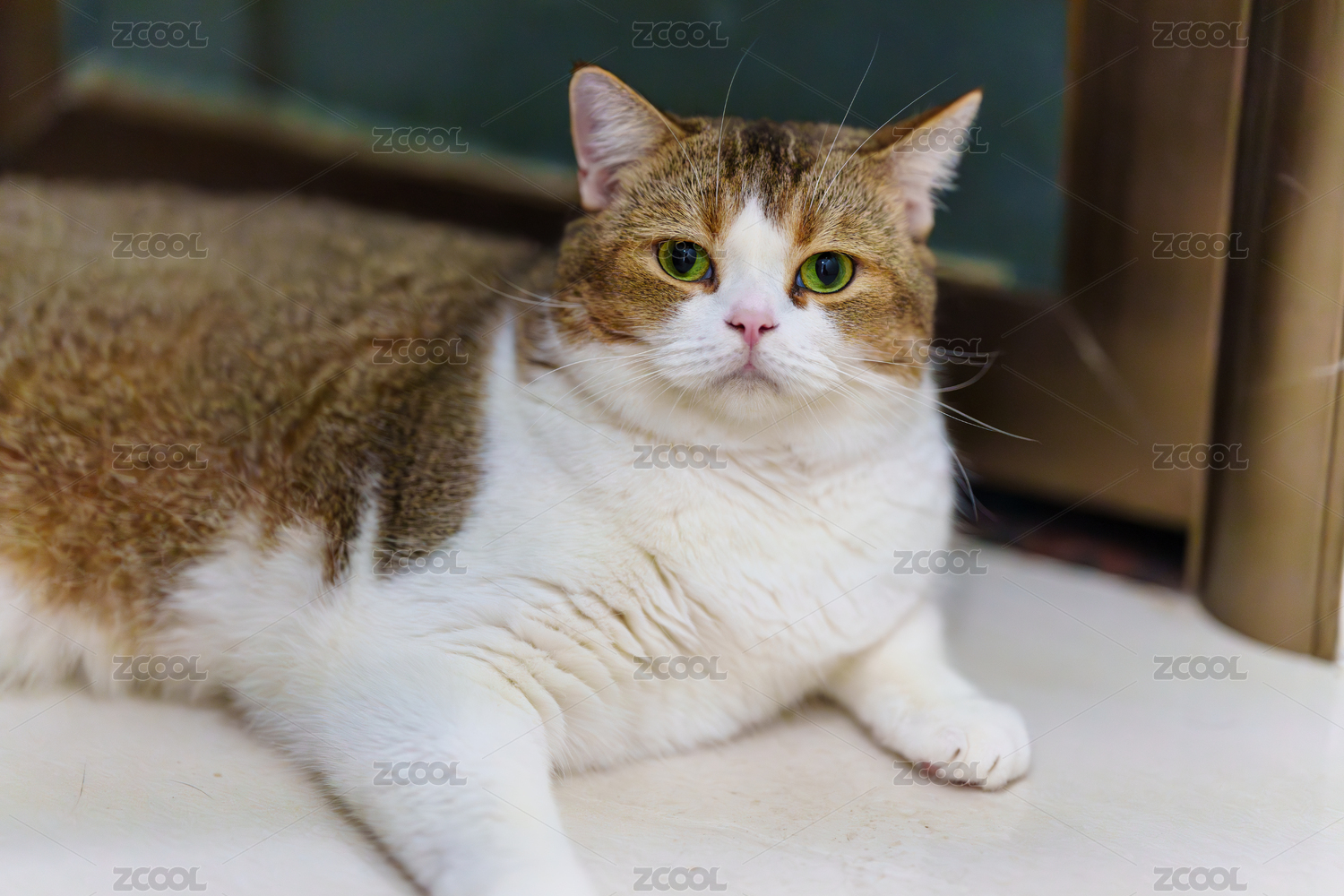 有些肥胖英国短毛猫舔完毛后看着周围的环境