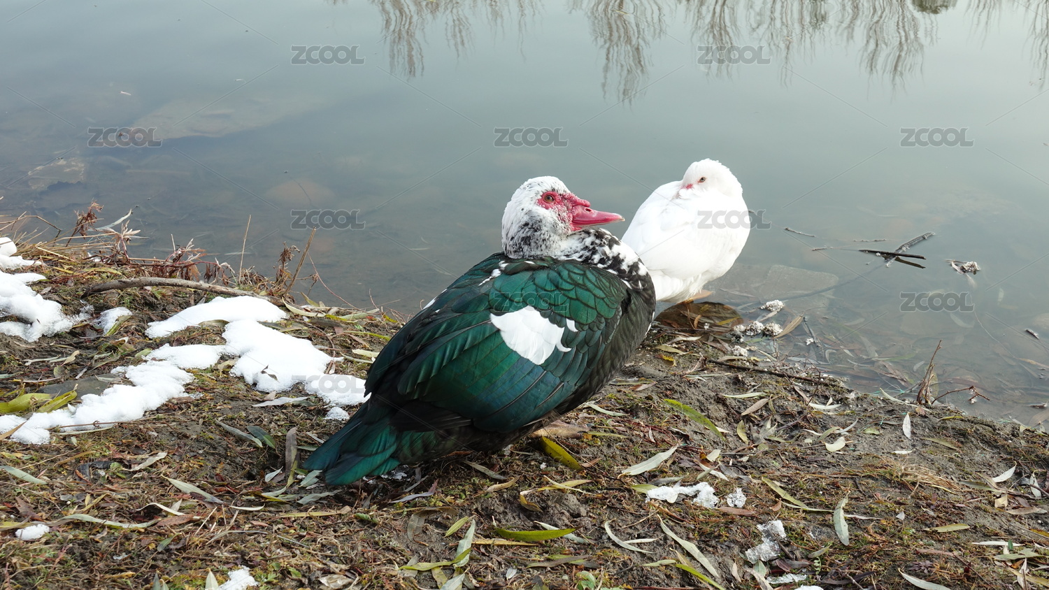 冬天水边的一雌一雄两只麝香鸭