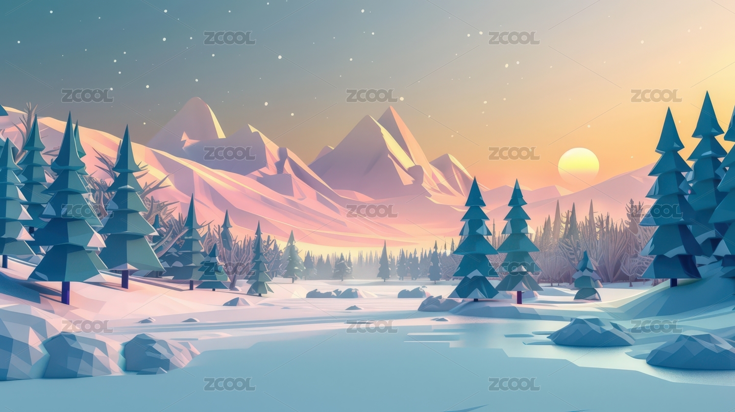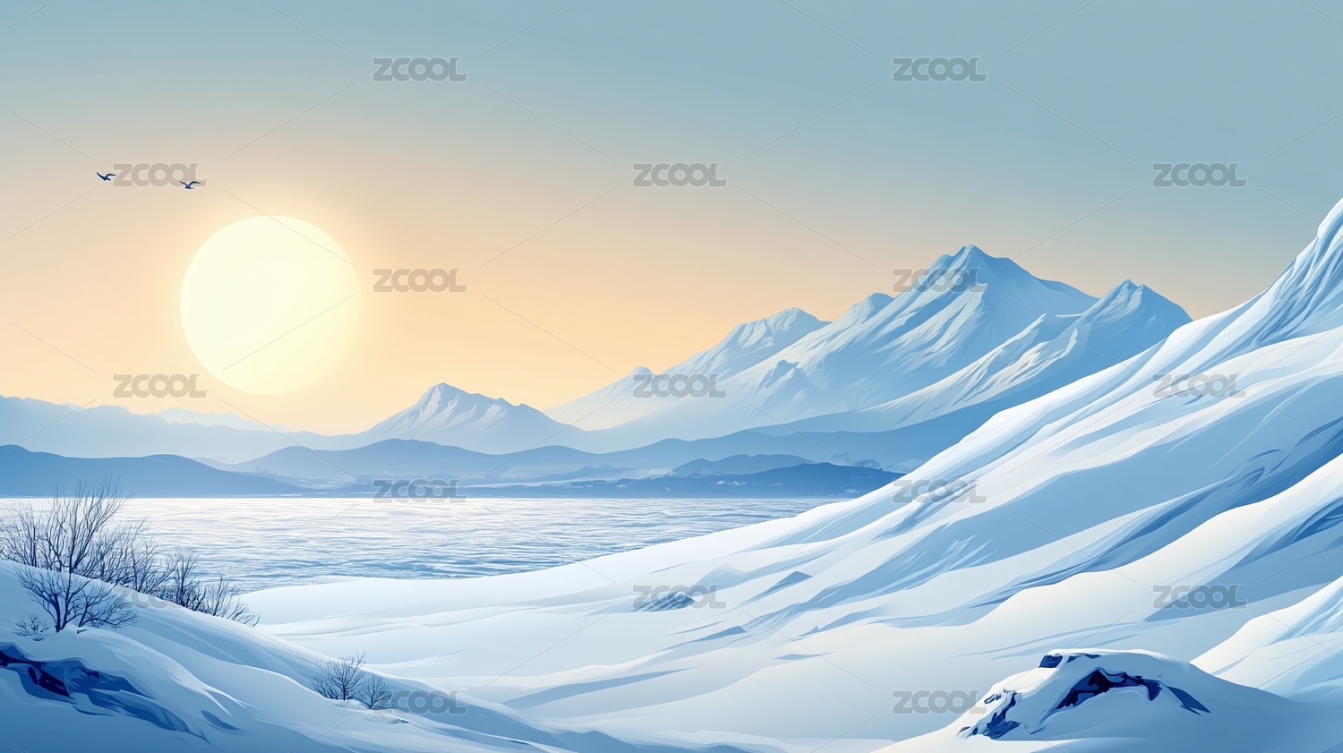青绿山水,黄昏,冬天,山,雪山,雪,河流,树,中国风,日出