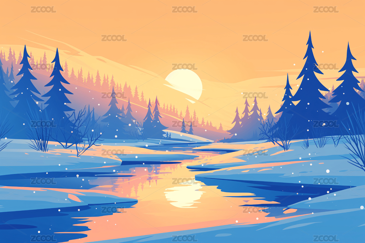 冬季大雪节气插画,雪景中的冬天河流场景插