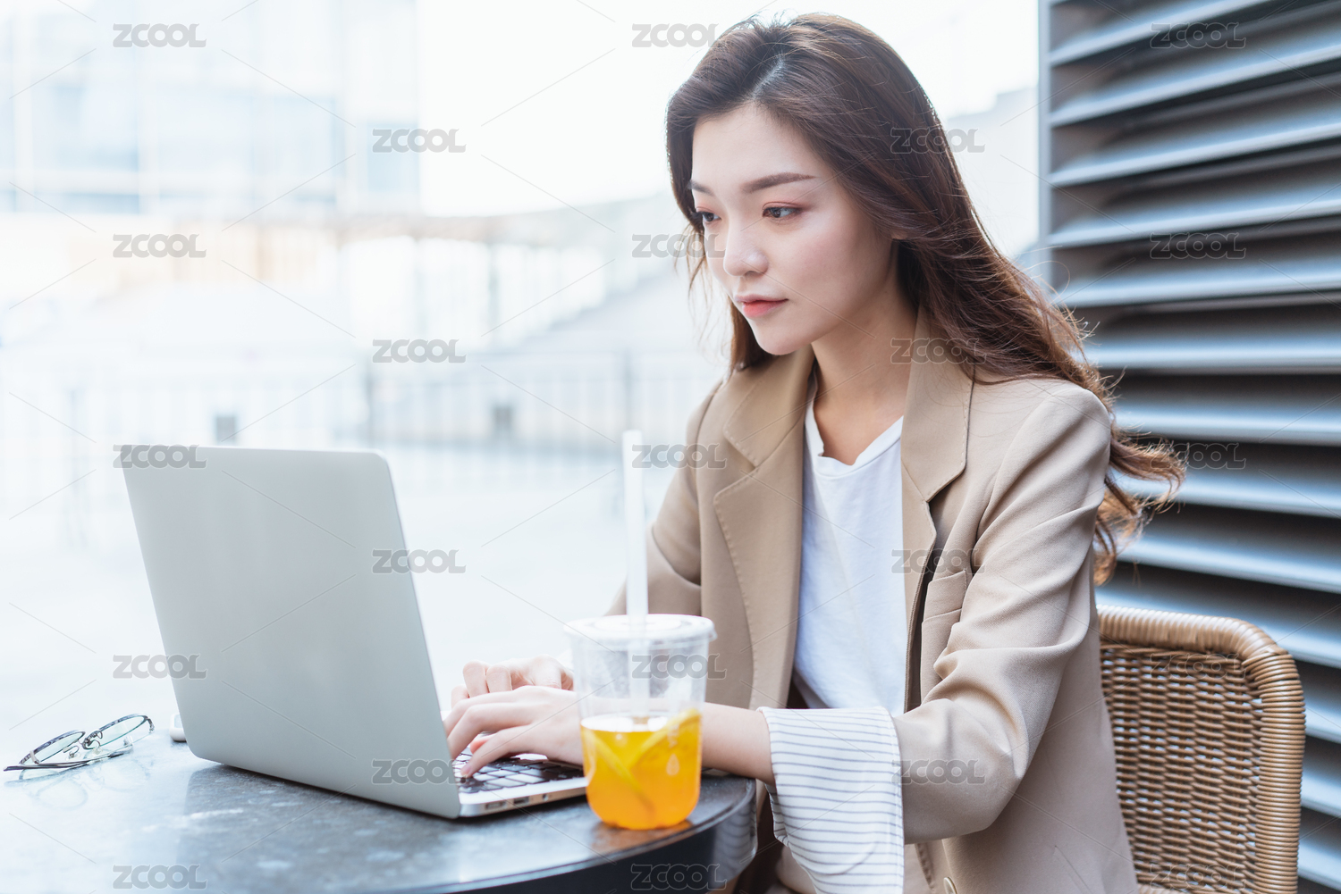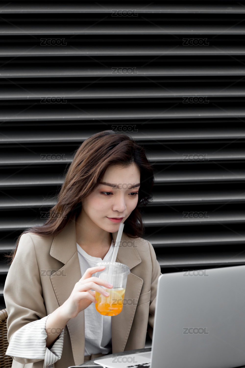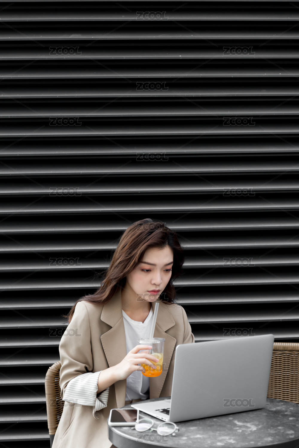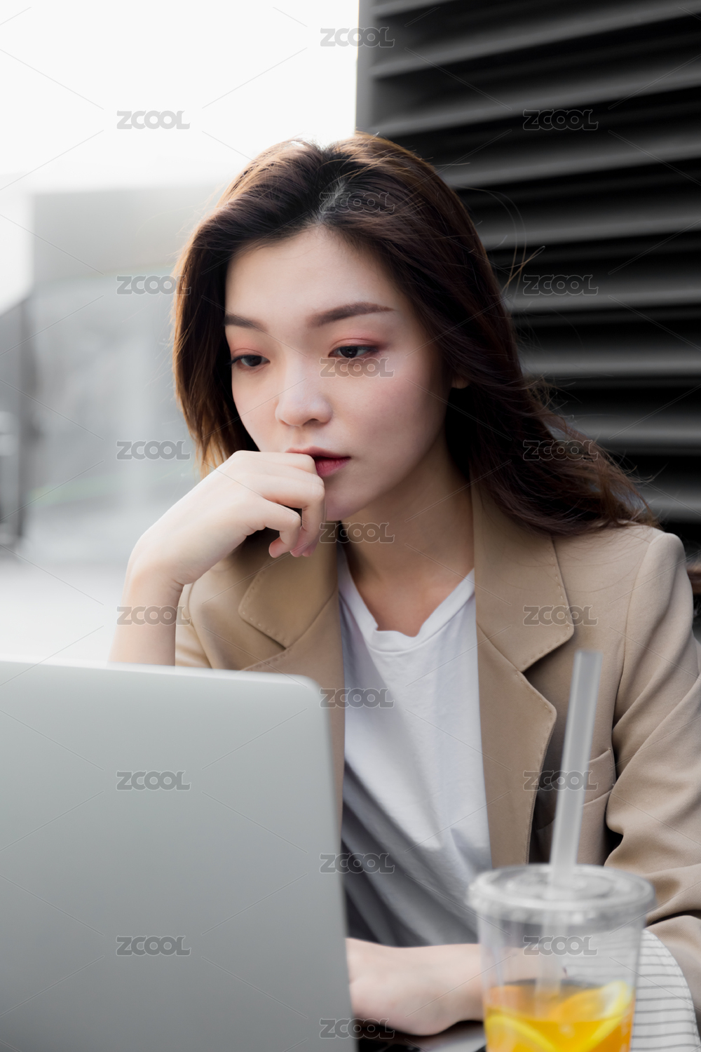 年轻亚洲商务人士在户外小圆桌上看电脑