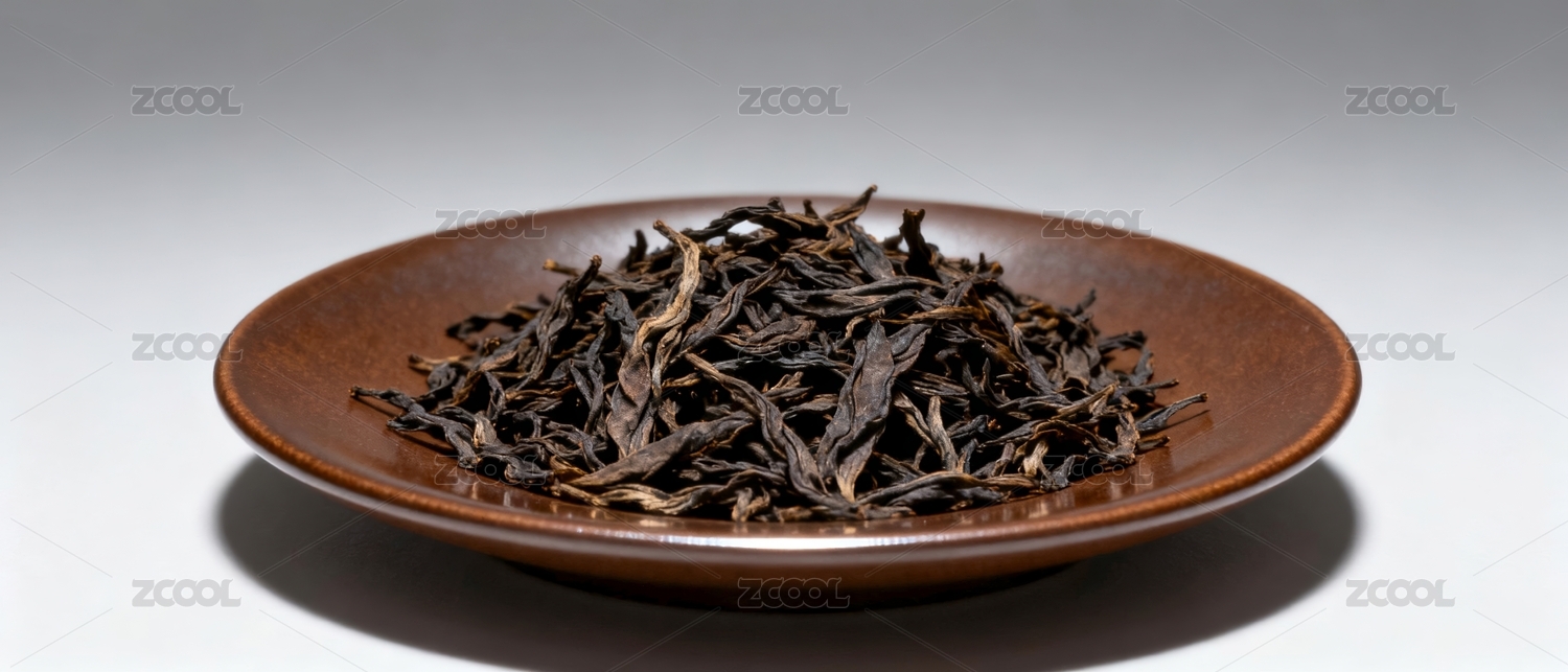 黑色背景里一茶盘颗粒状普洱熟茶散茶