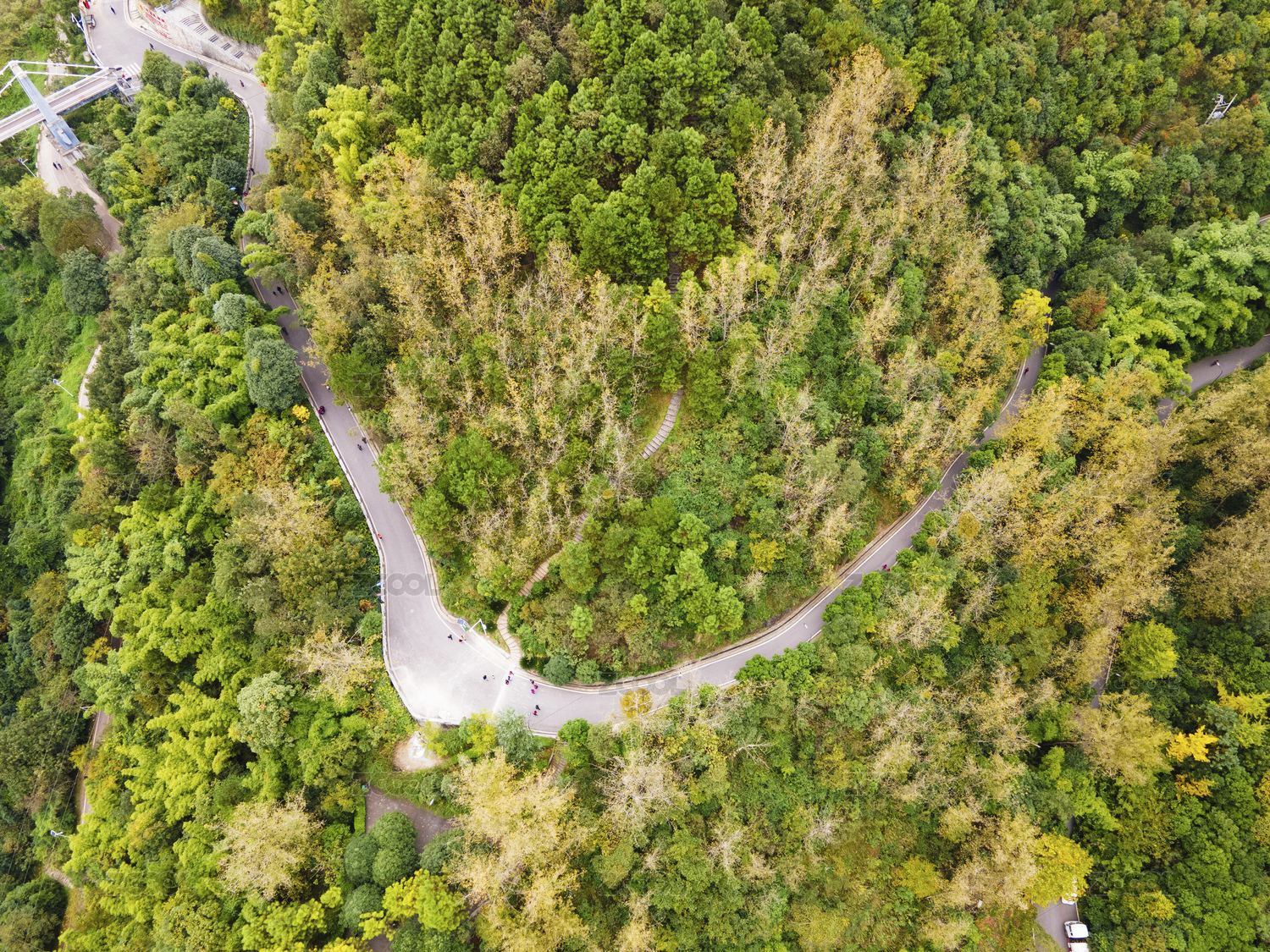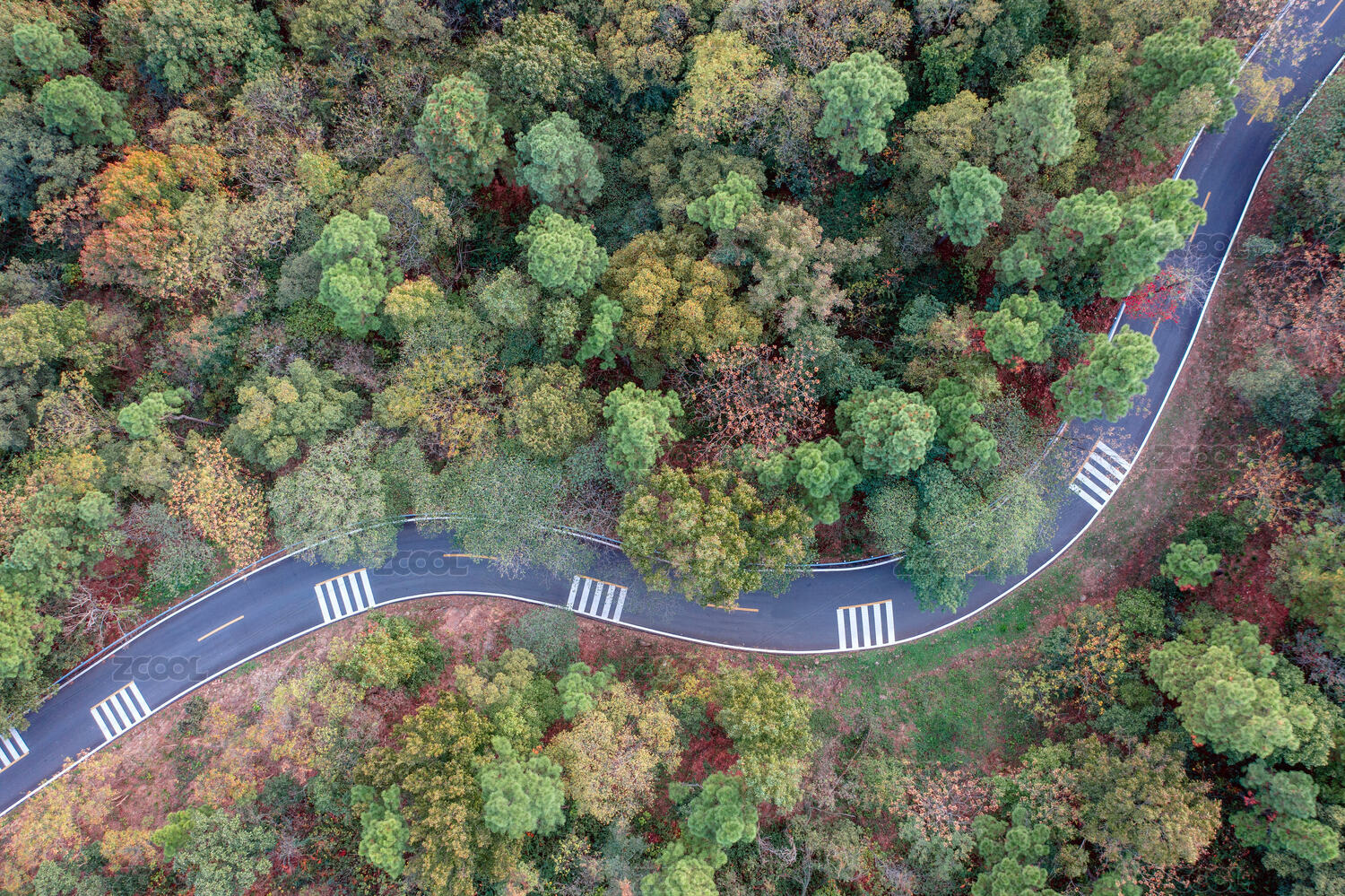 俯视江苏南京穿过五彩斑斓森林蜿蜒的公路