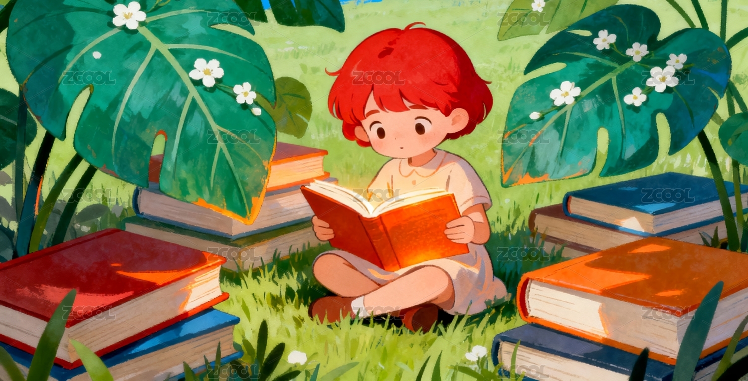 红发儿童户外阅读场景