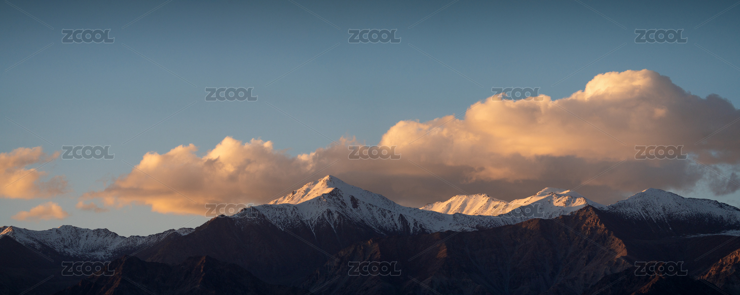 中国青海大柴旦美丽的雪山雪峰晚霞日落火烧云日照金山全景图风景图
