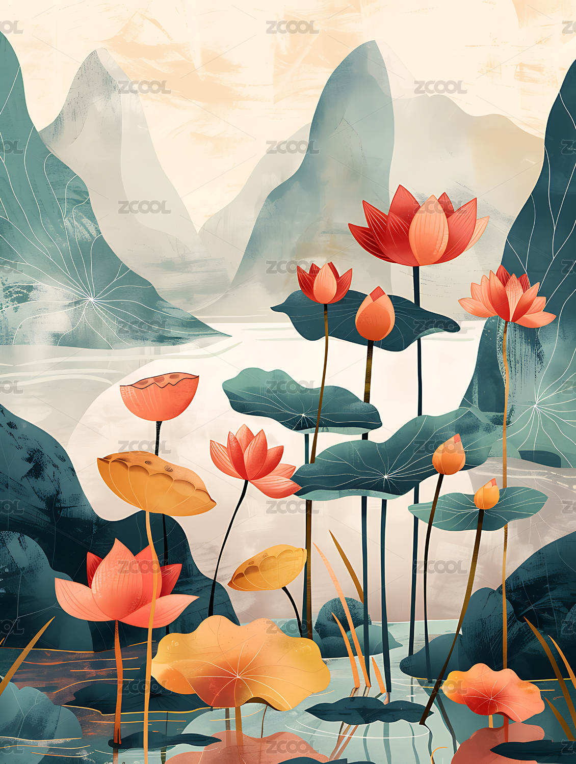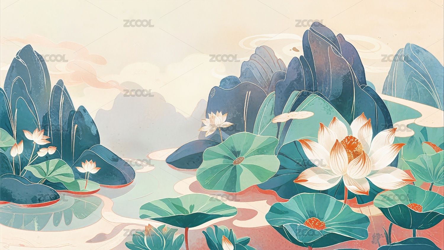 国风复古荷塘景色插画