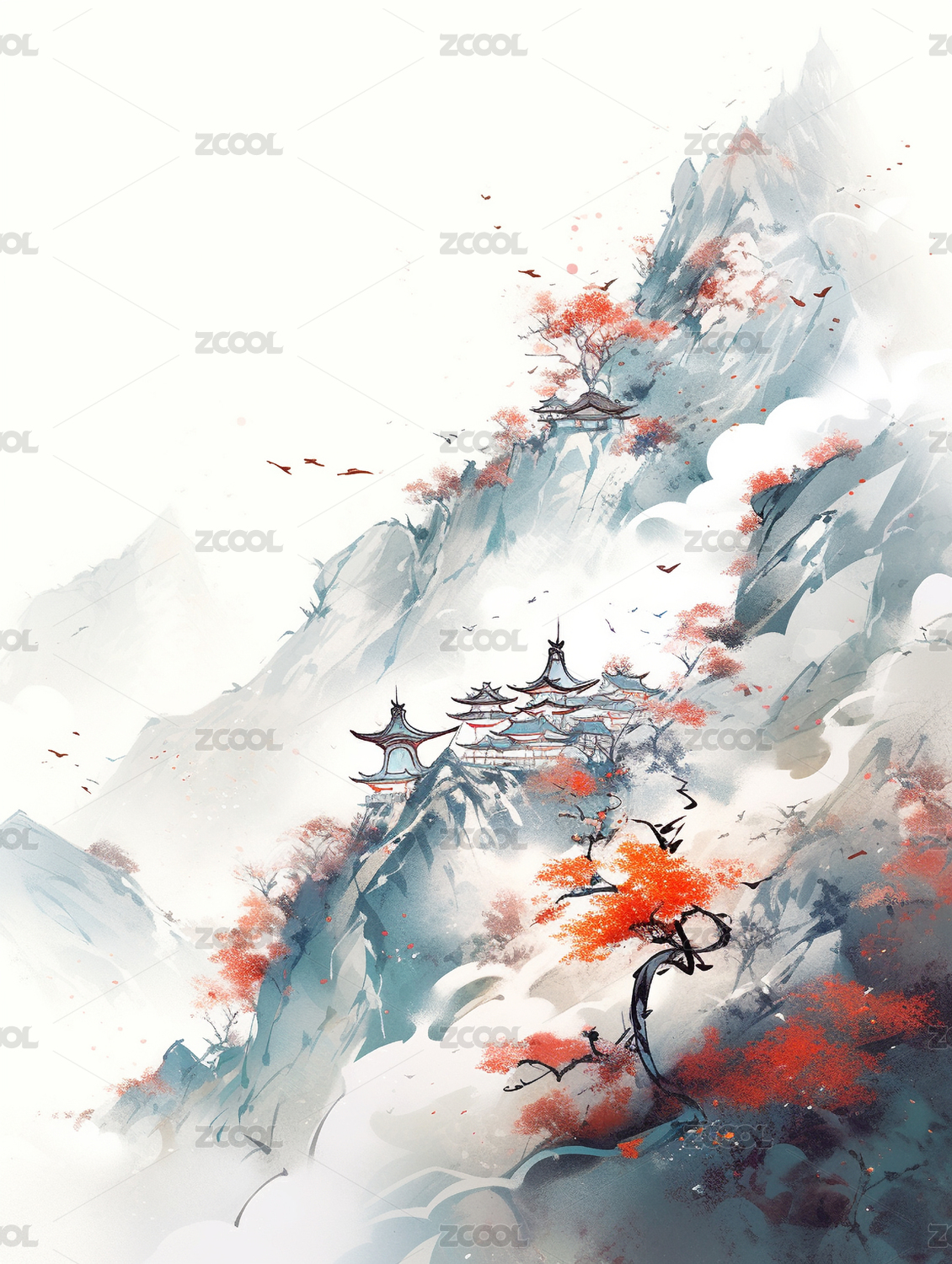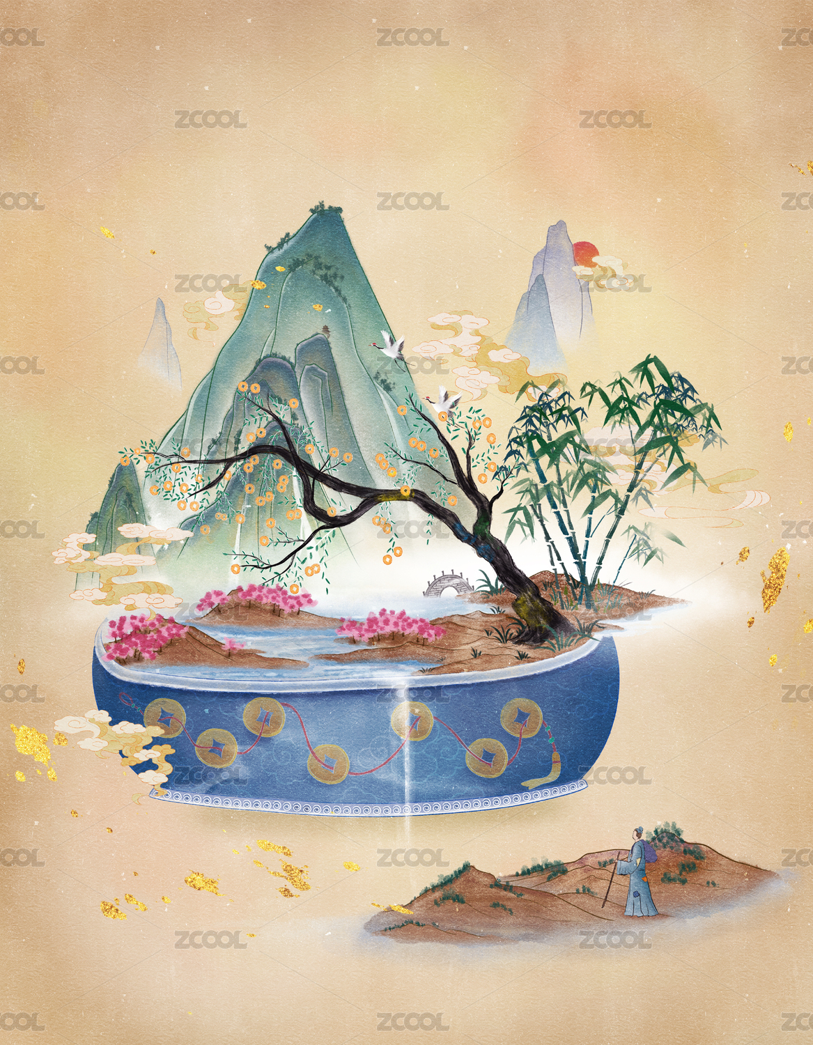 中式山川风景手绘插画