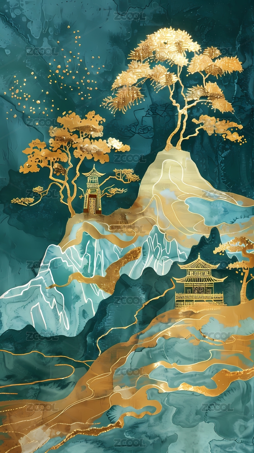 传统金青绿山亭台楼阁插画海报背景