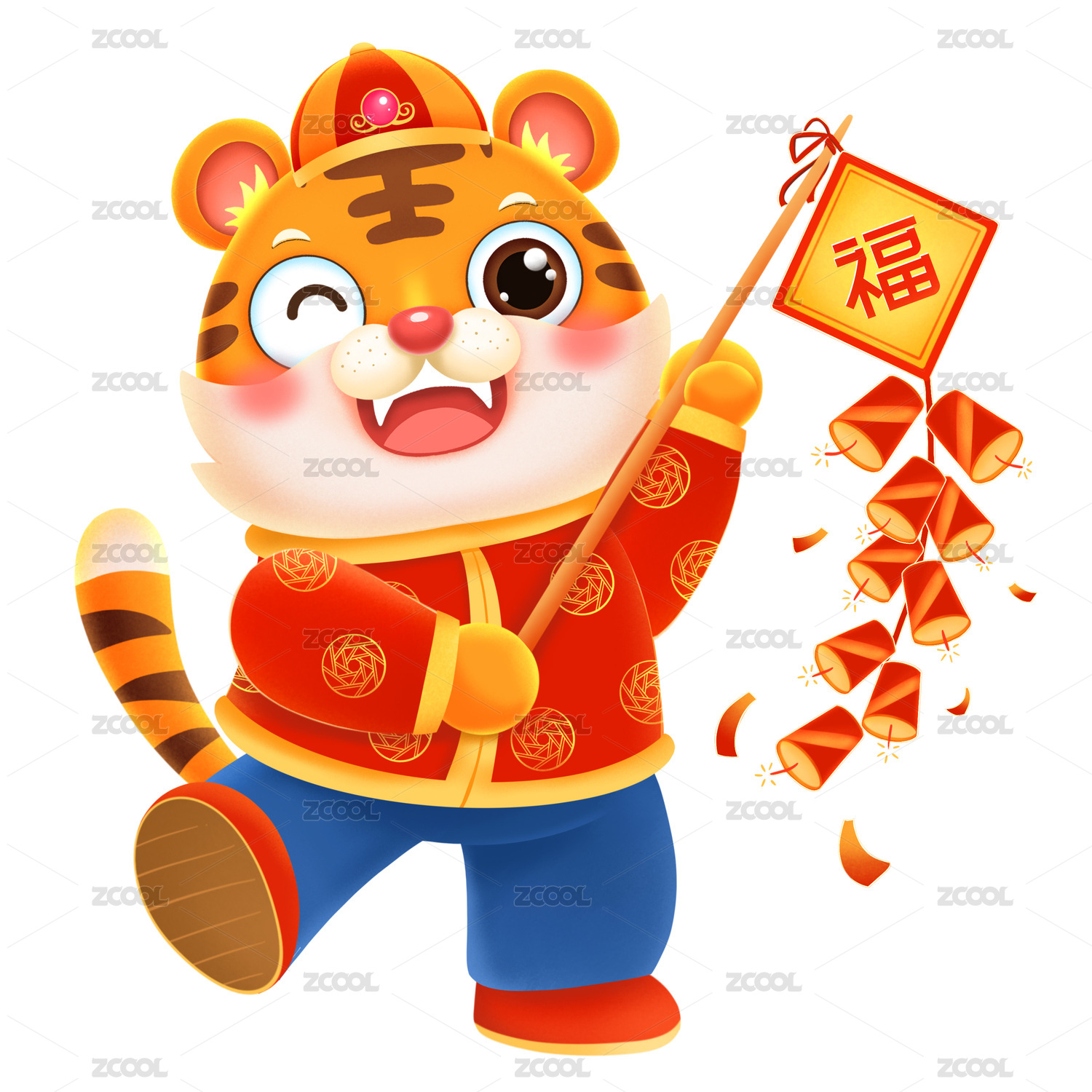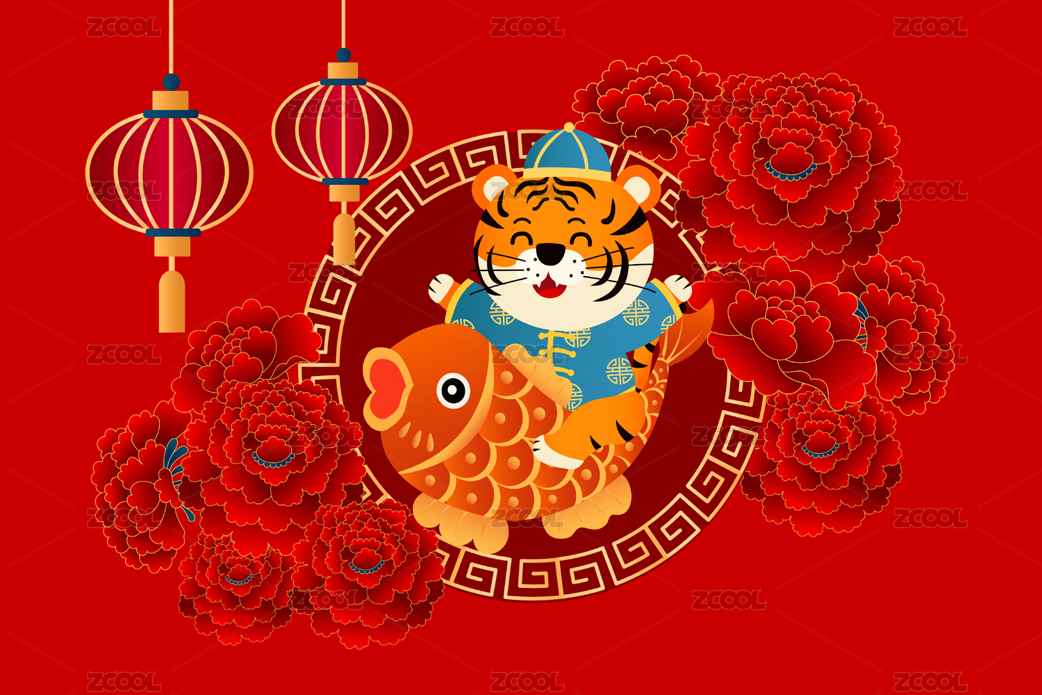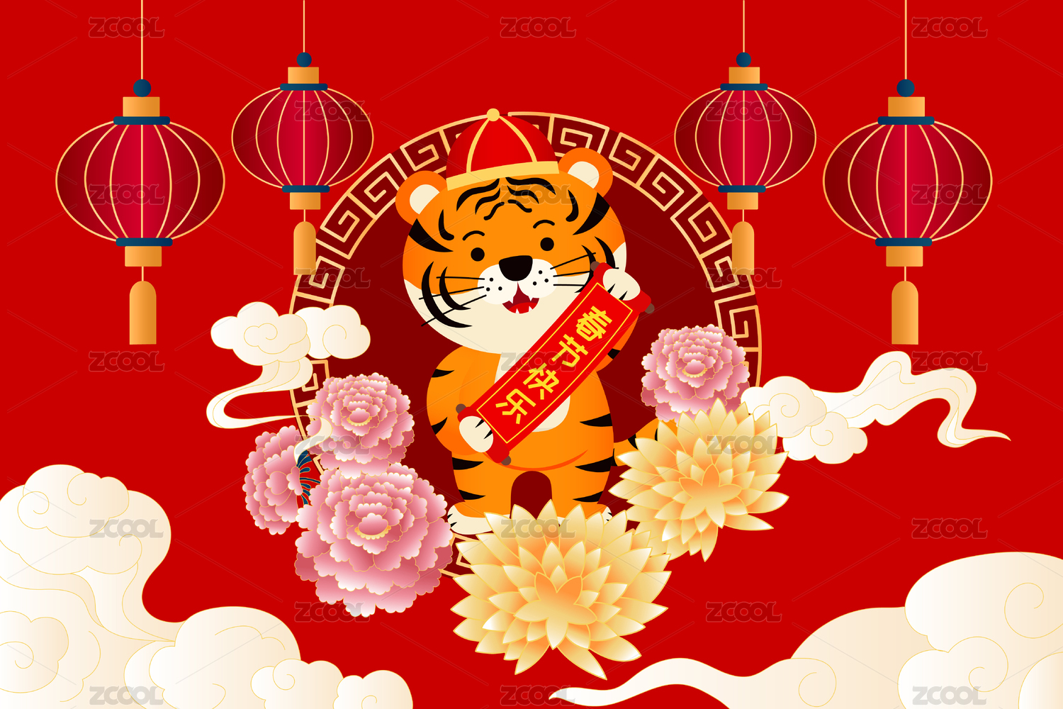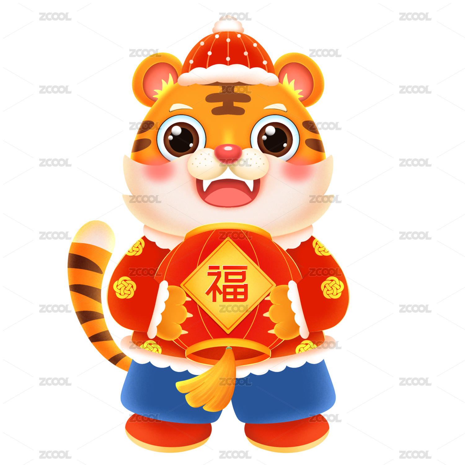 国潮新年春节虎年可爱老虎抱灯笼元素
