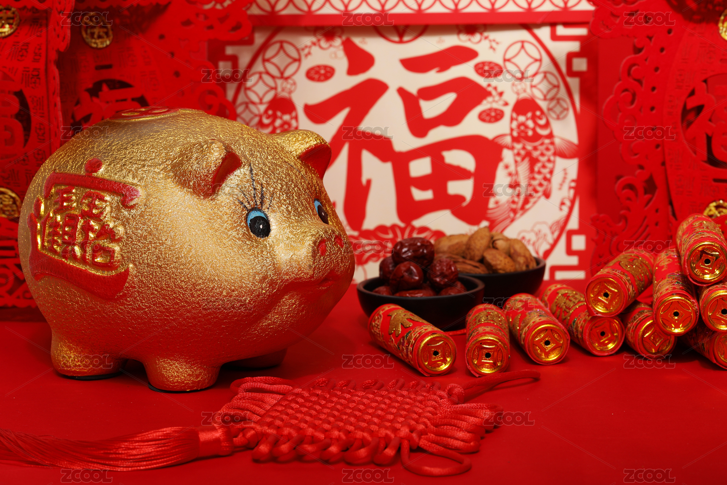 金币、金元宝、毛笔、对联和鼠年的吉祥物
