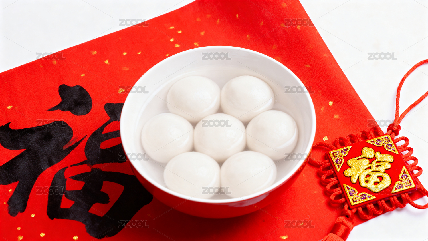 煮熟的元宵节汤圆在毛笔手写春联背景上