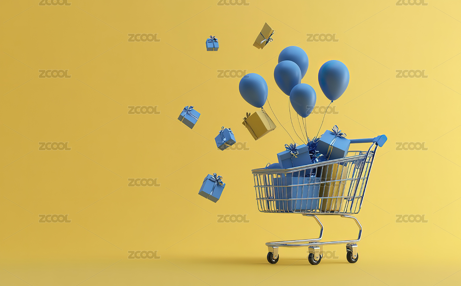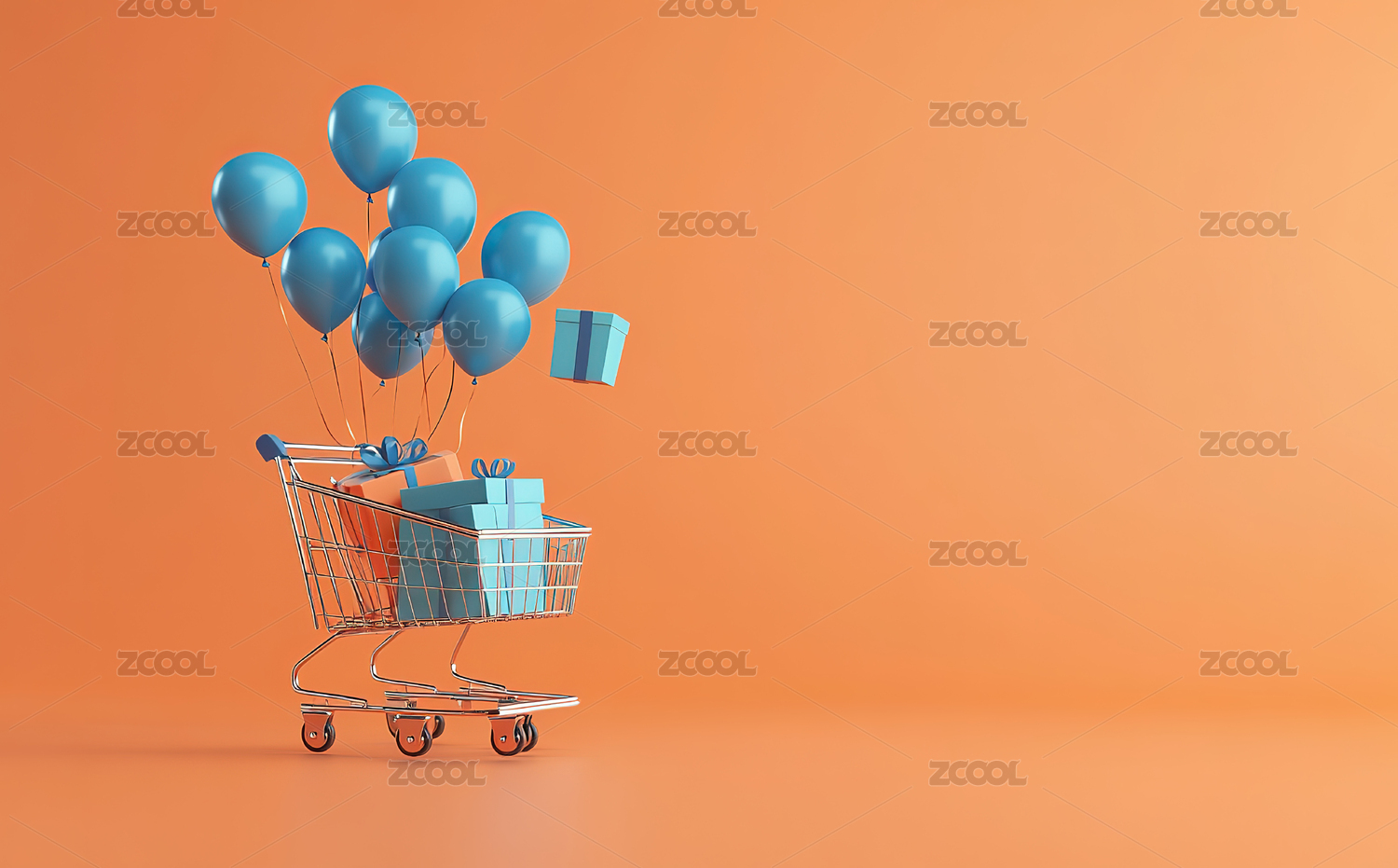 橙色背景下的购物车和气球