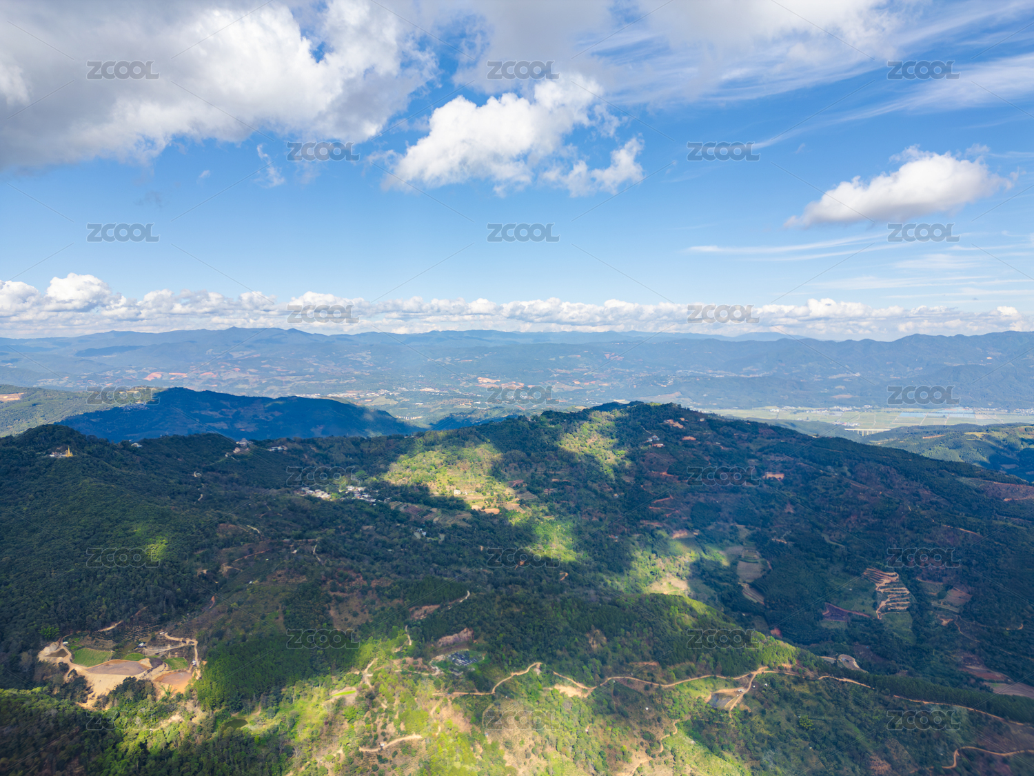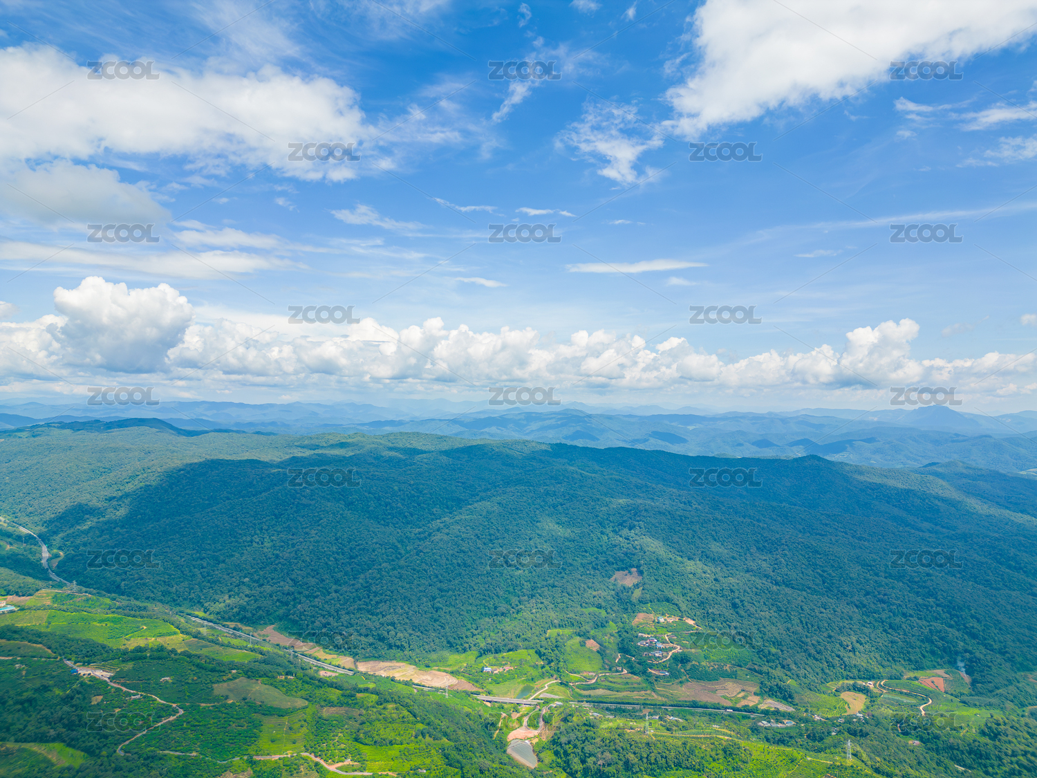 航拍蓝天白云下广阔无垠绿意盎然的山地景观