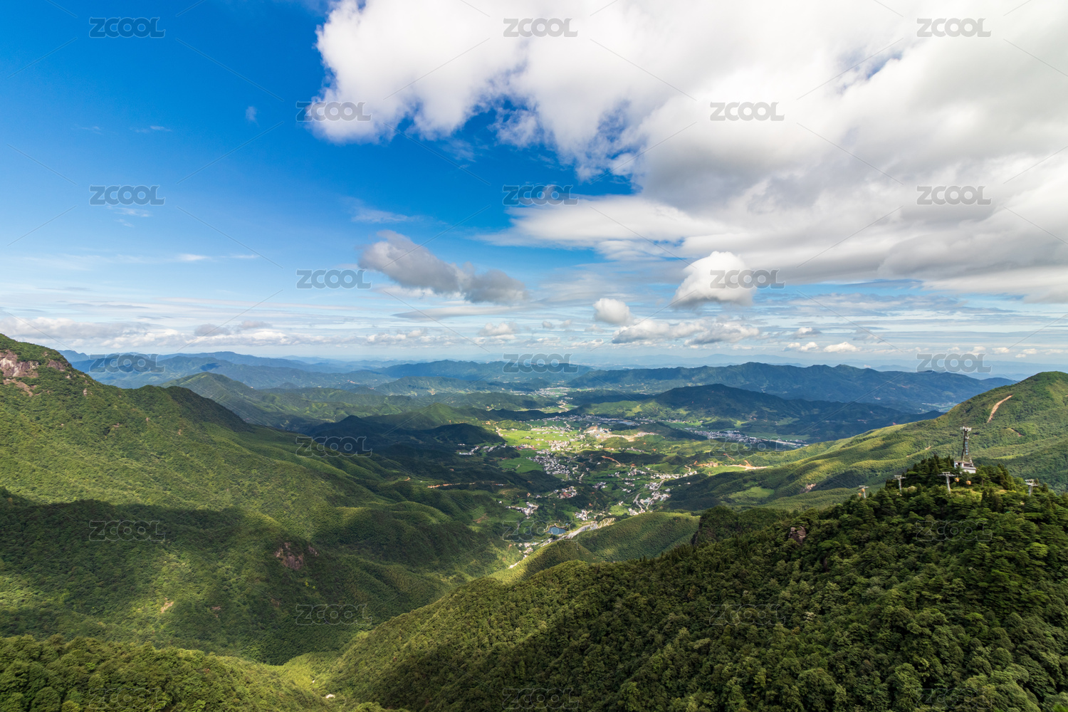 蓝天白云下映衬下的绿色山峰