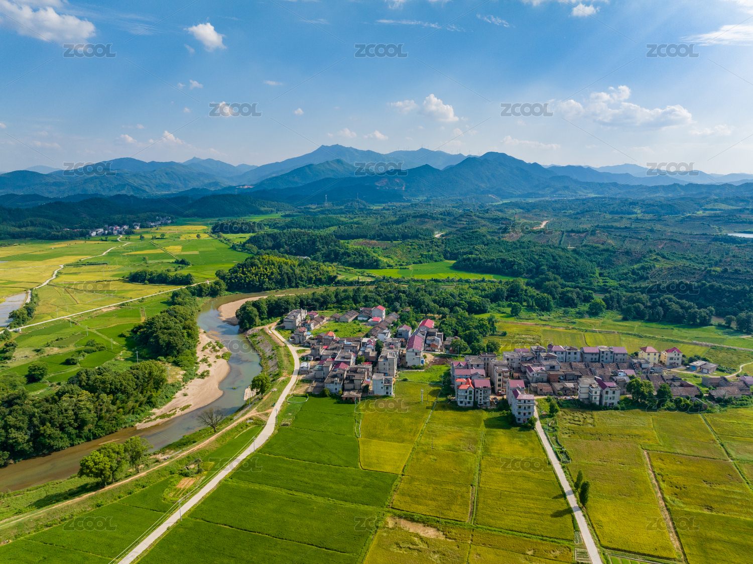 江西,丰城,田园风光,房屋,农村,蓝天白云,绿色,稻田,水稻,早稻