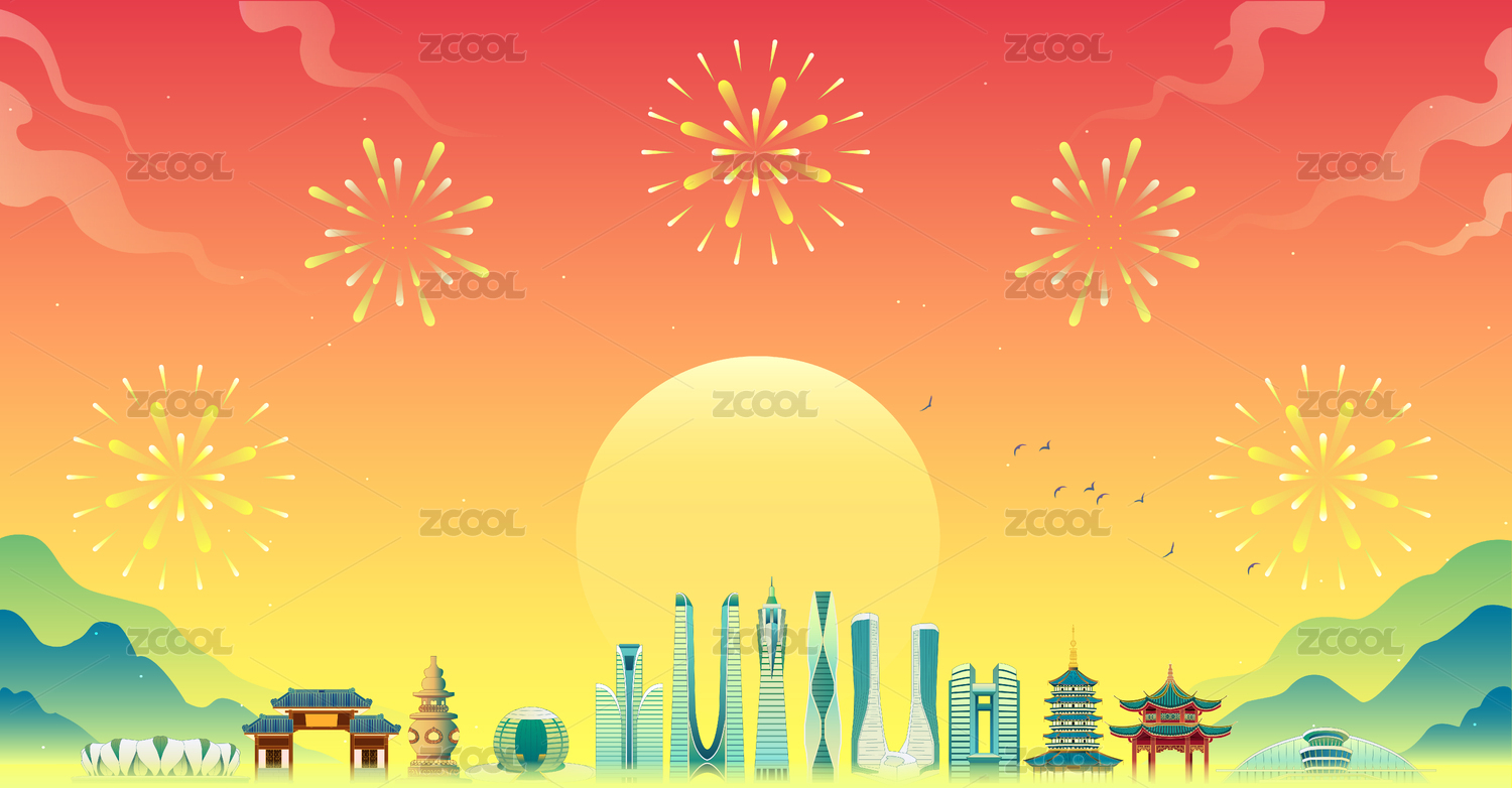 国潮风杭州建筑传统节日矢量山水插画