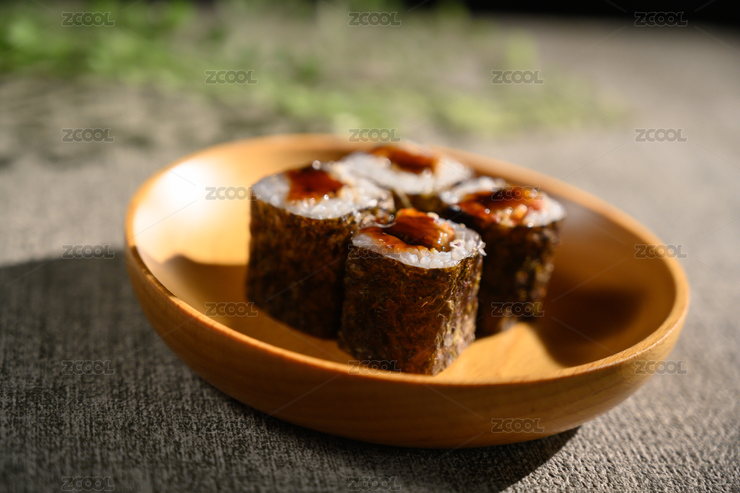桌面上的盘子里的美味可口的吞拿鱼小卷