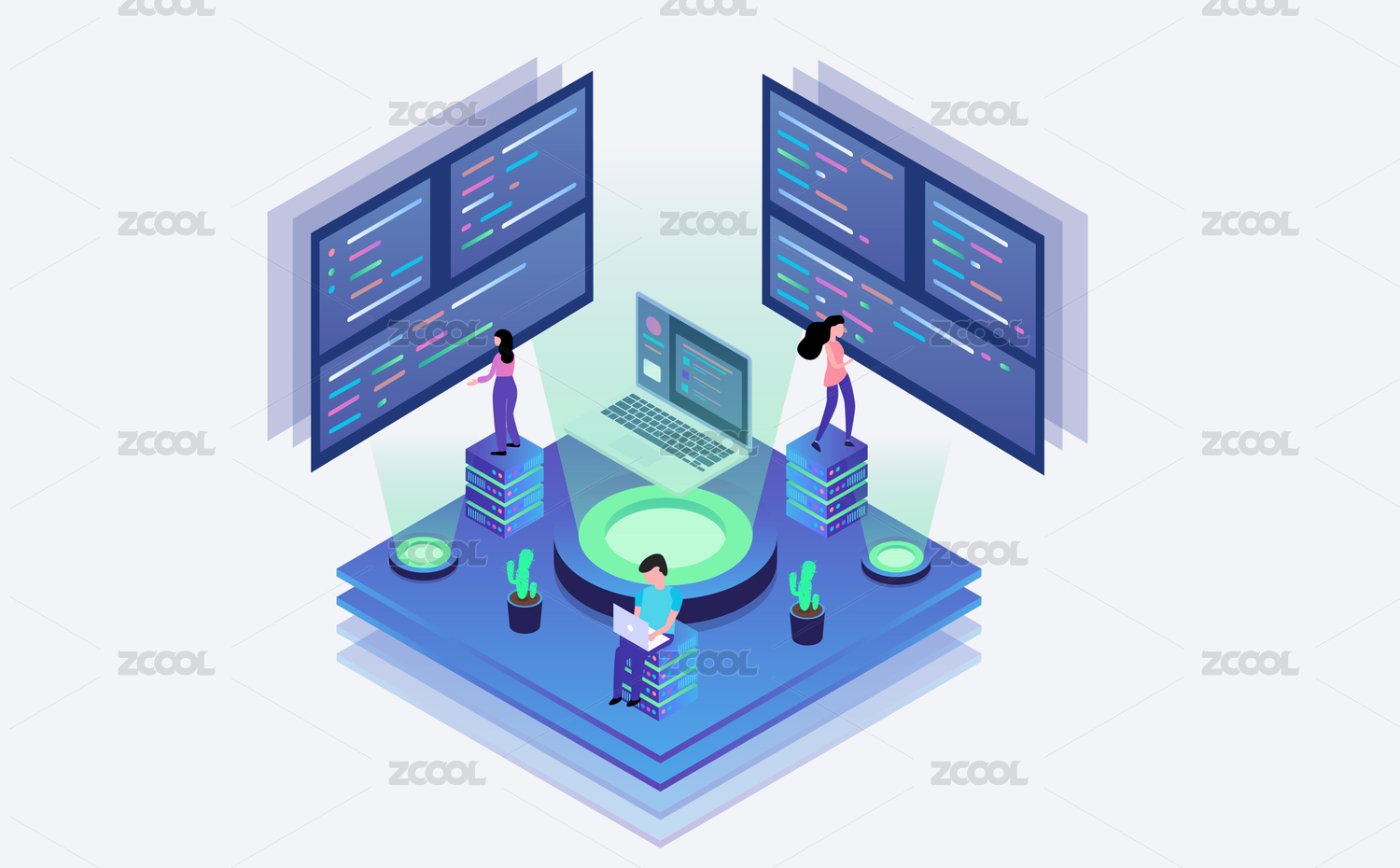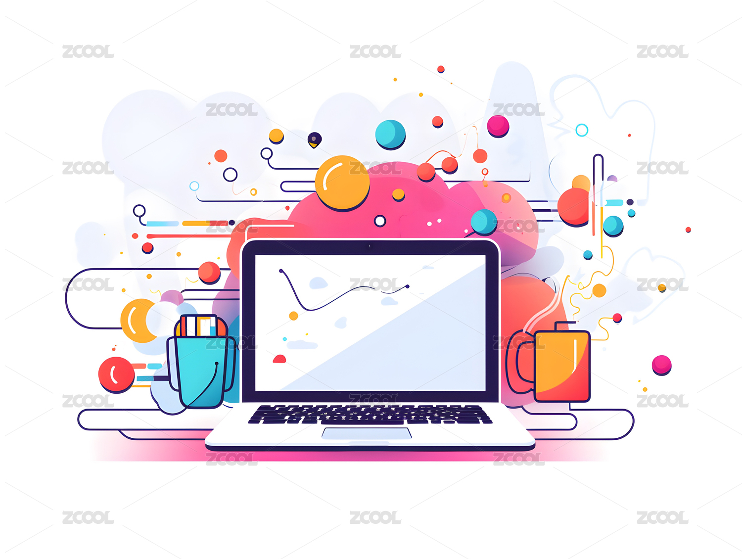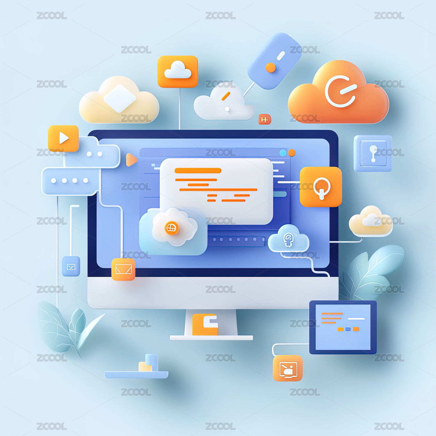 带有编程代码的电脑屏幕边漂浮着应用程序图