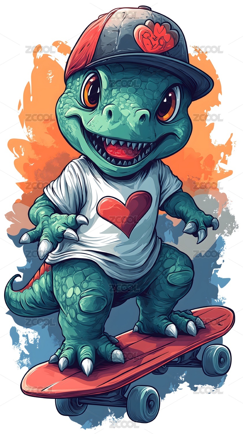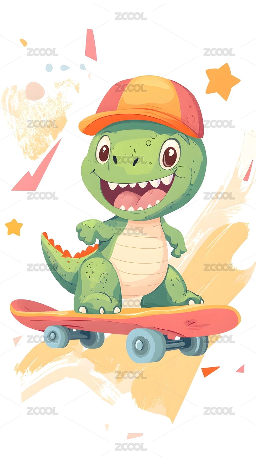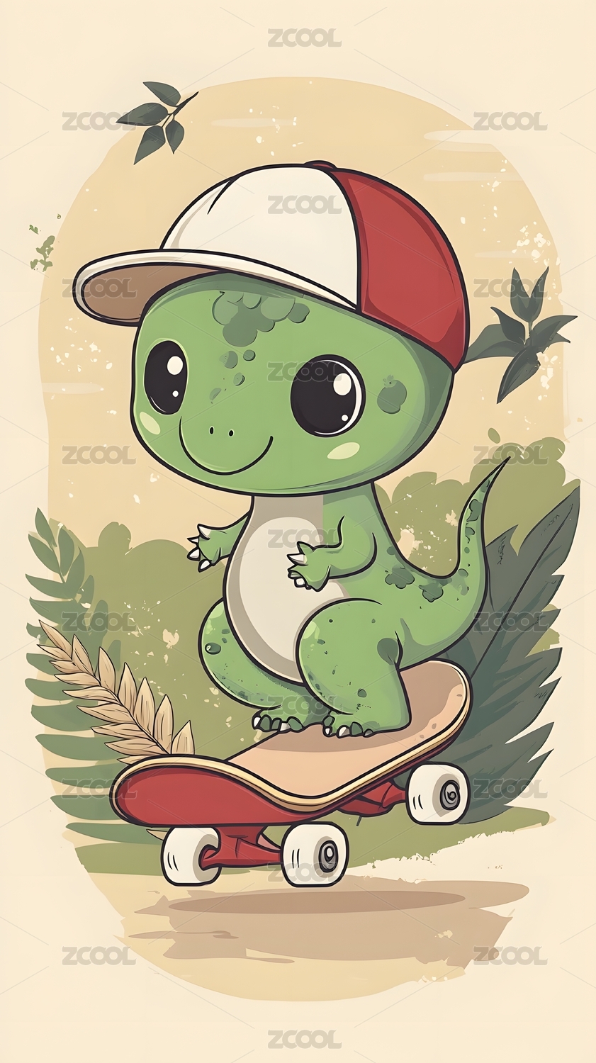恐龙,滑板,卡通,可爱,童趣,绿色,快乐,玩耍,帽子,潮流