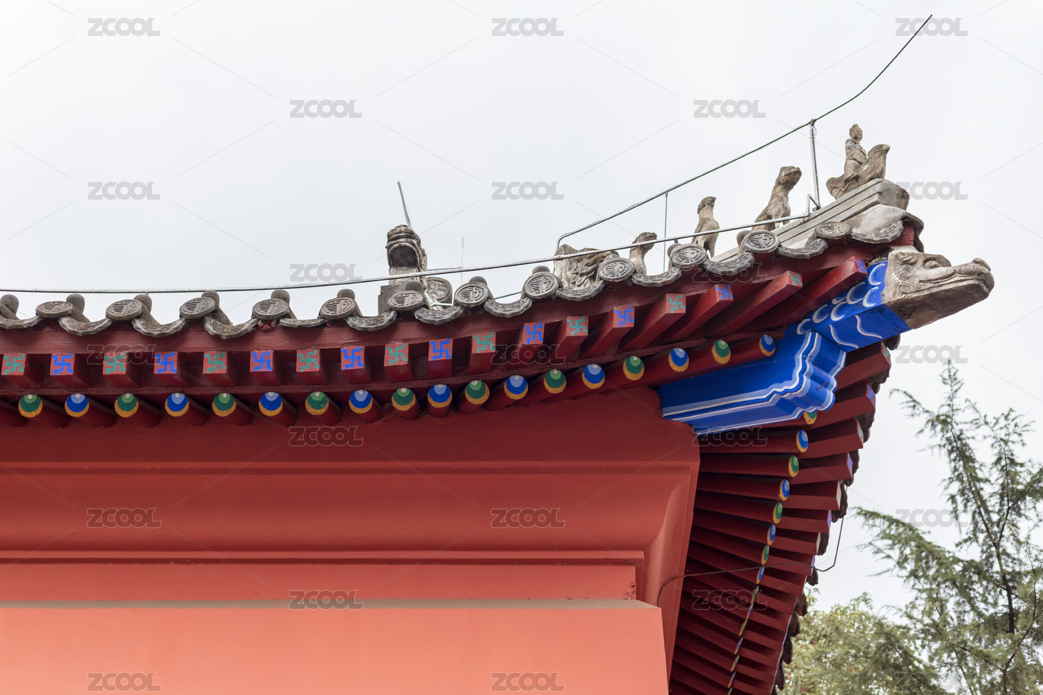 中国的寺庙屋檐与绿树