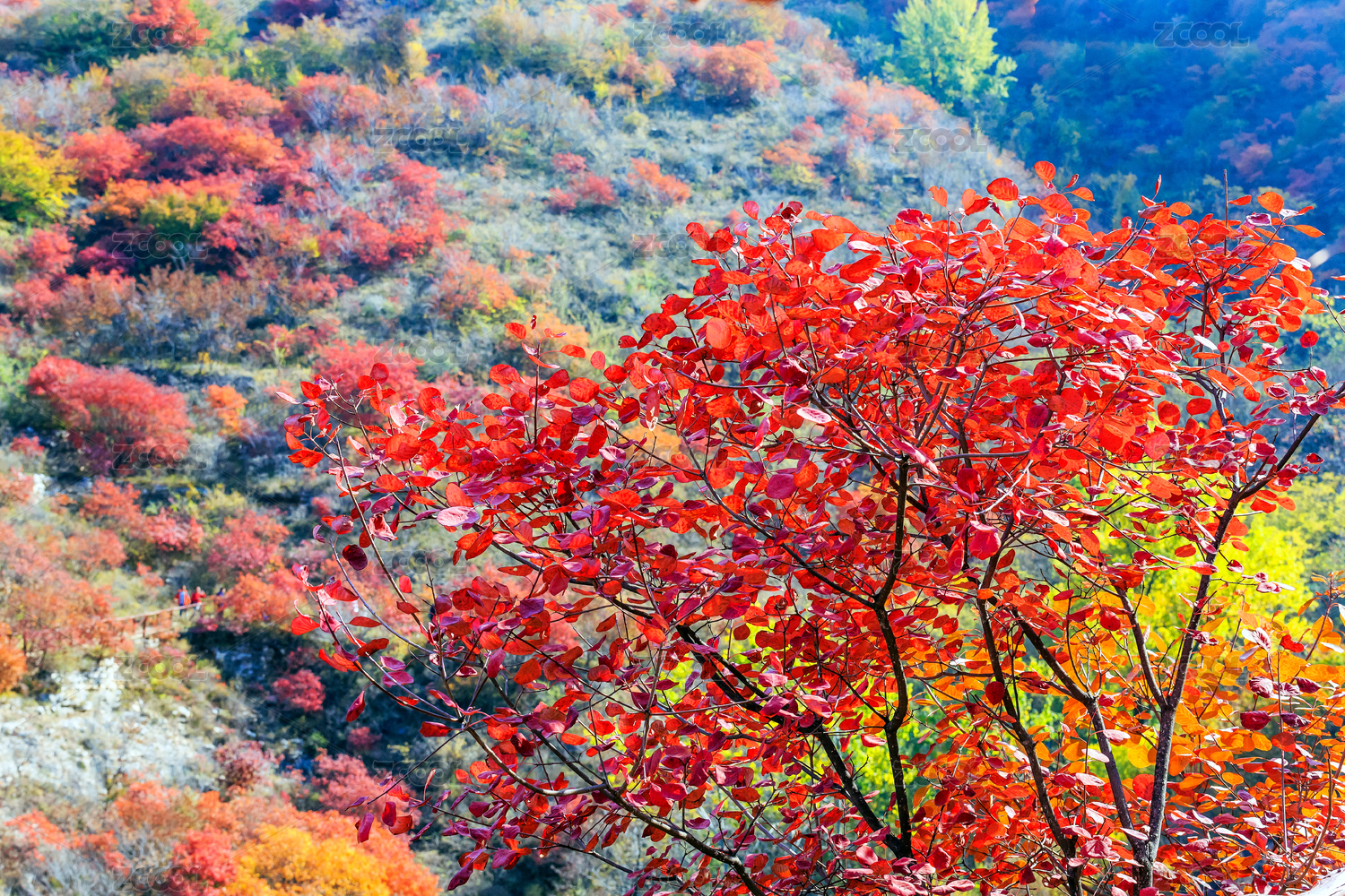 北方秋天山坳里的火红的黄栌树红叶