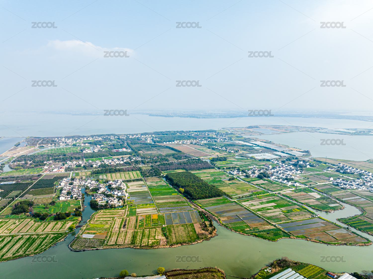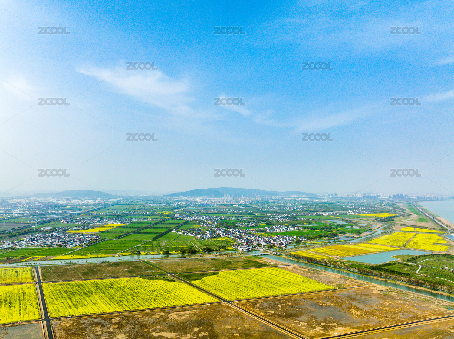 航拍江苏南京星罗棋布黄色花田中的水乡村落