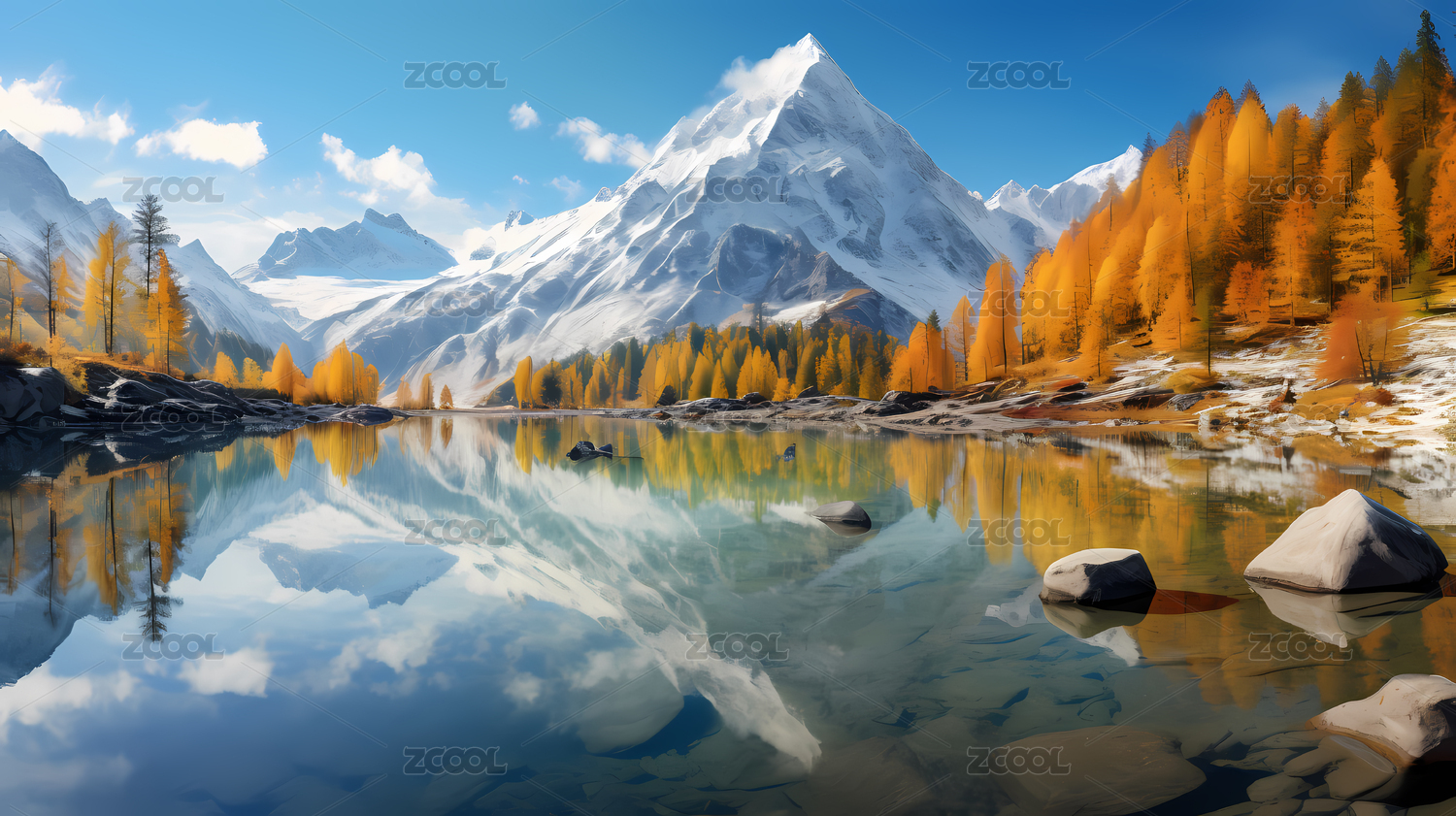 秋日雪山湖畔美景