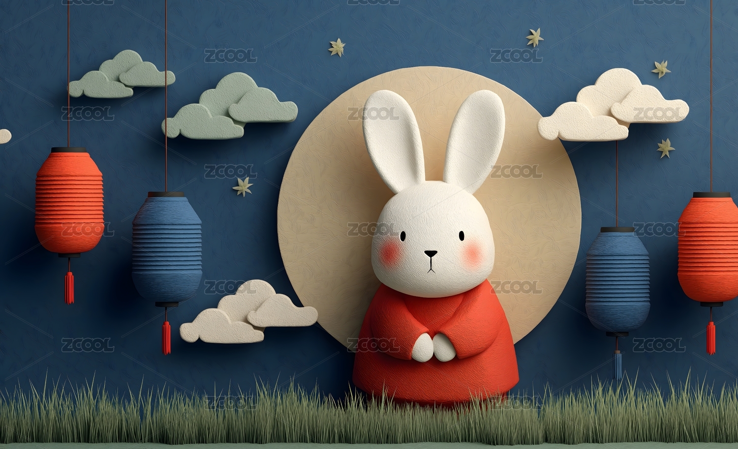兔子玉兔月亮灯笼花3D立体风格