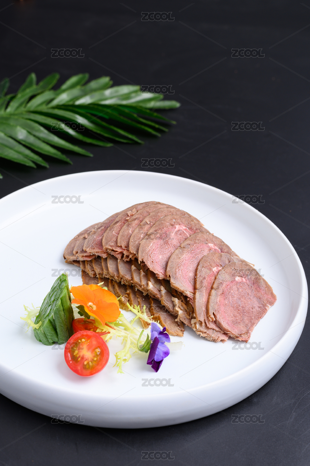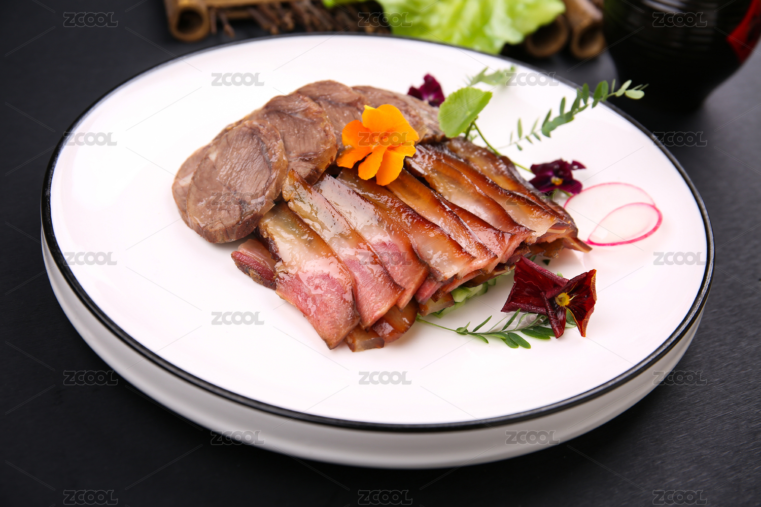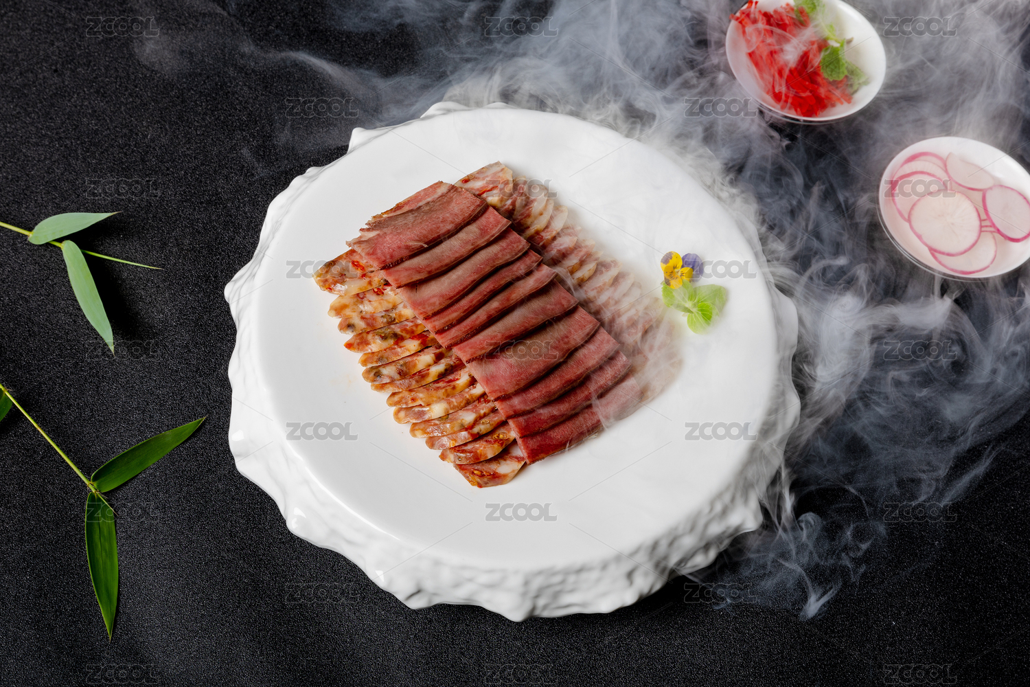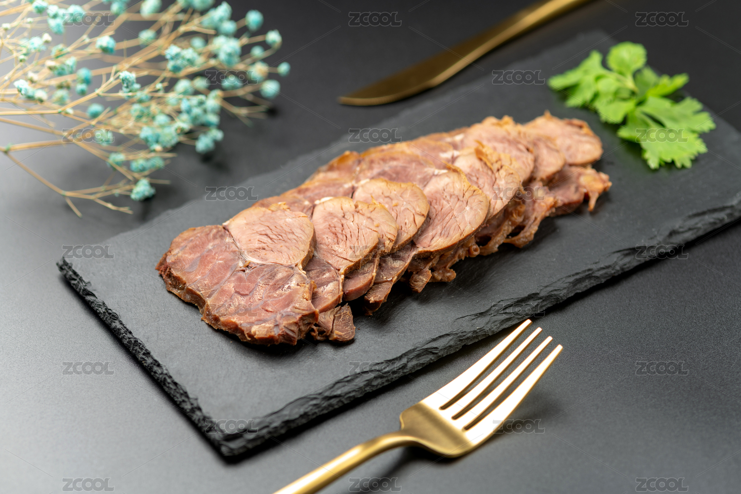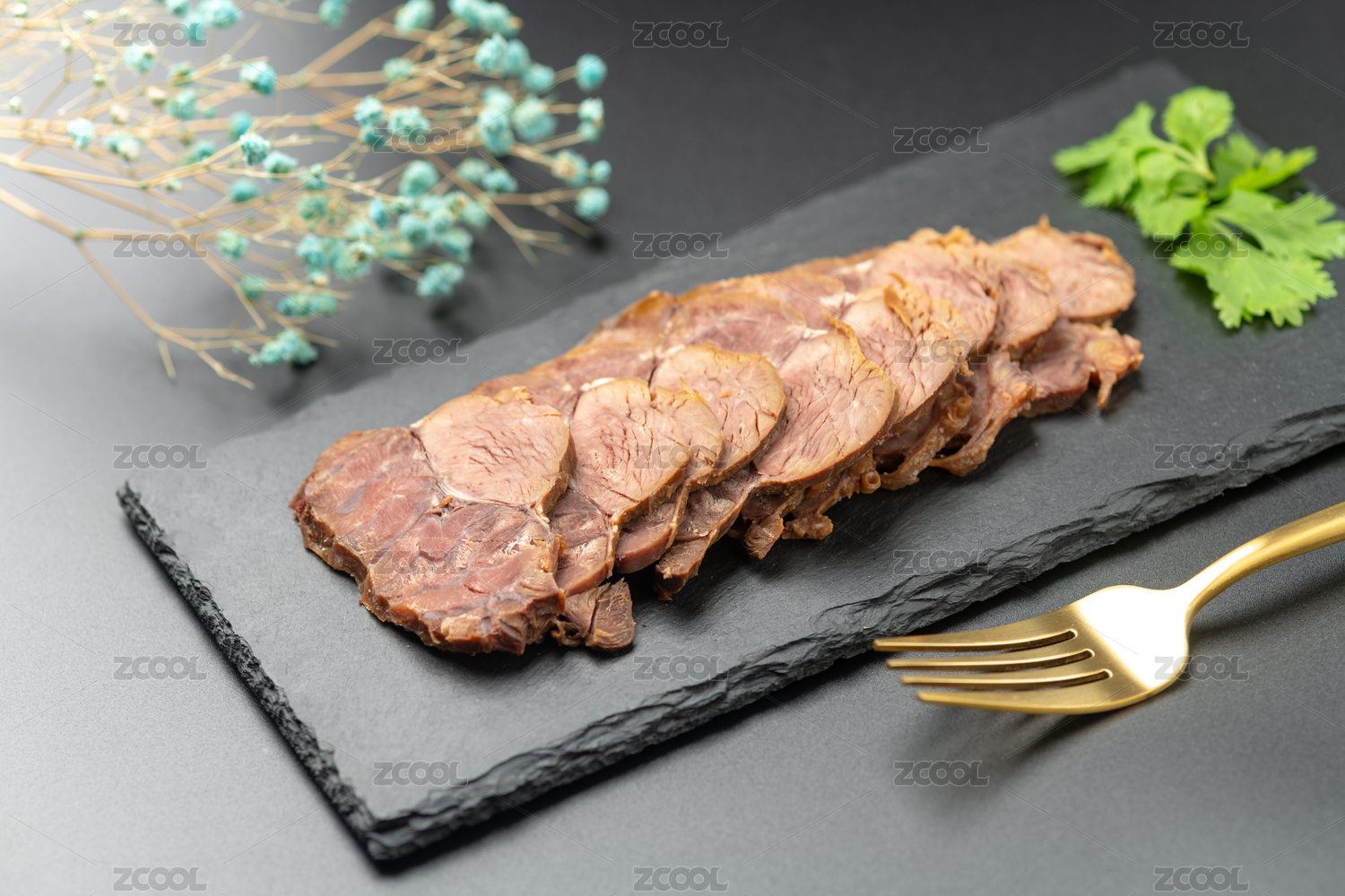 酱牛肉整齐的摆放在岩石板上黑色背景