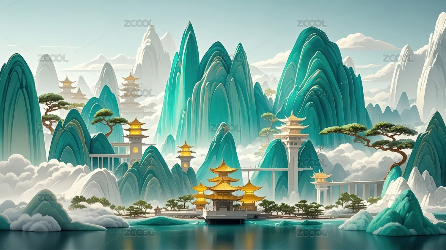 国潮山水三维插画