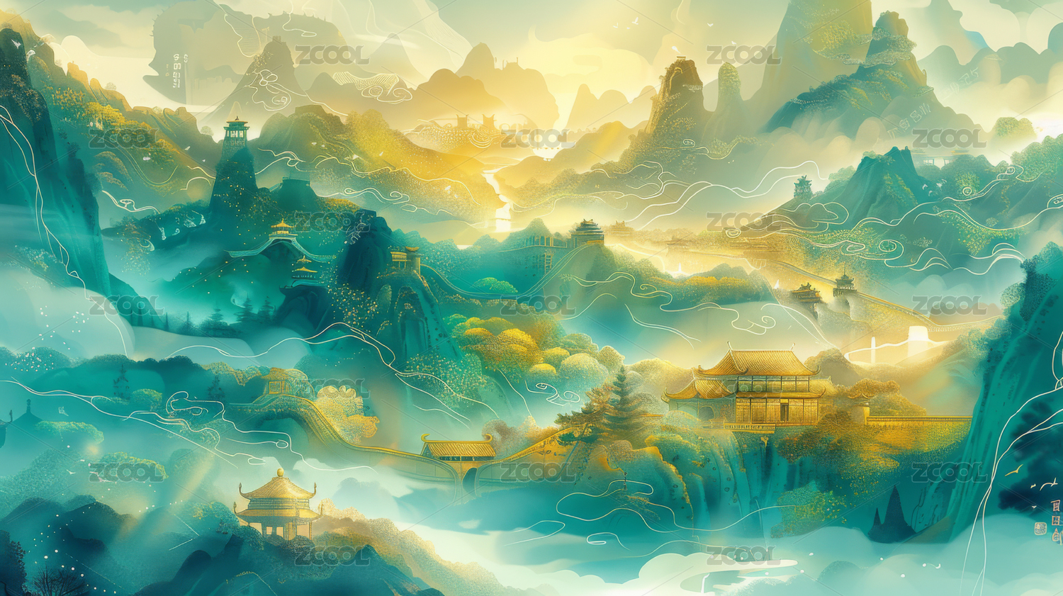 中国风山水画山谷里的亭台楼阁