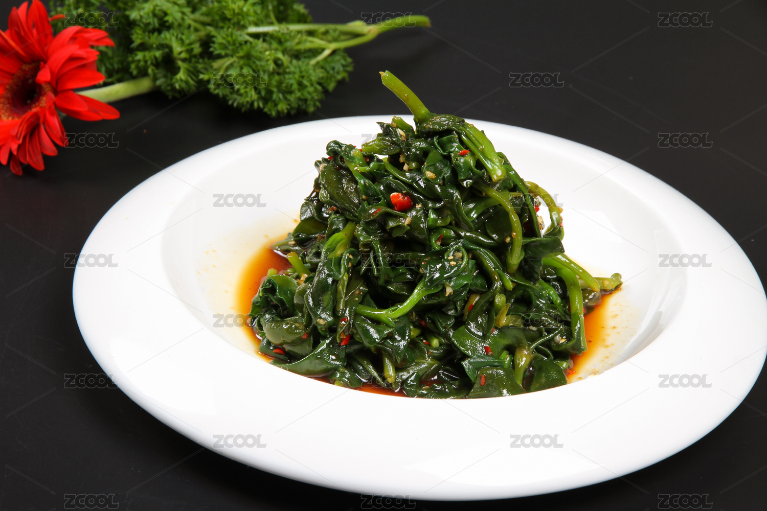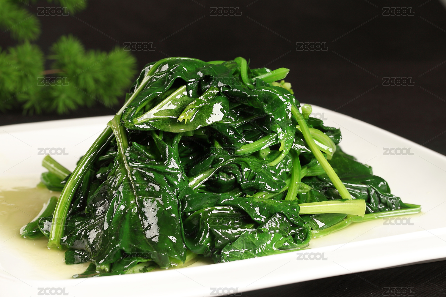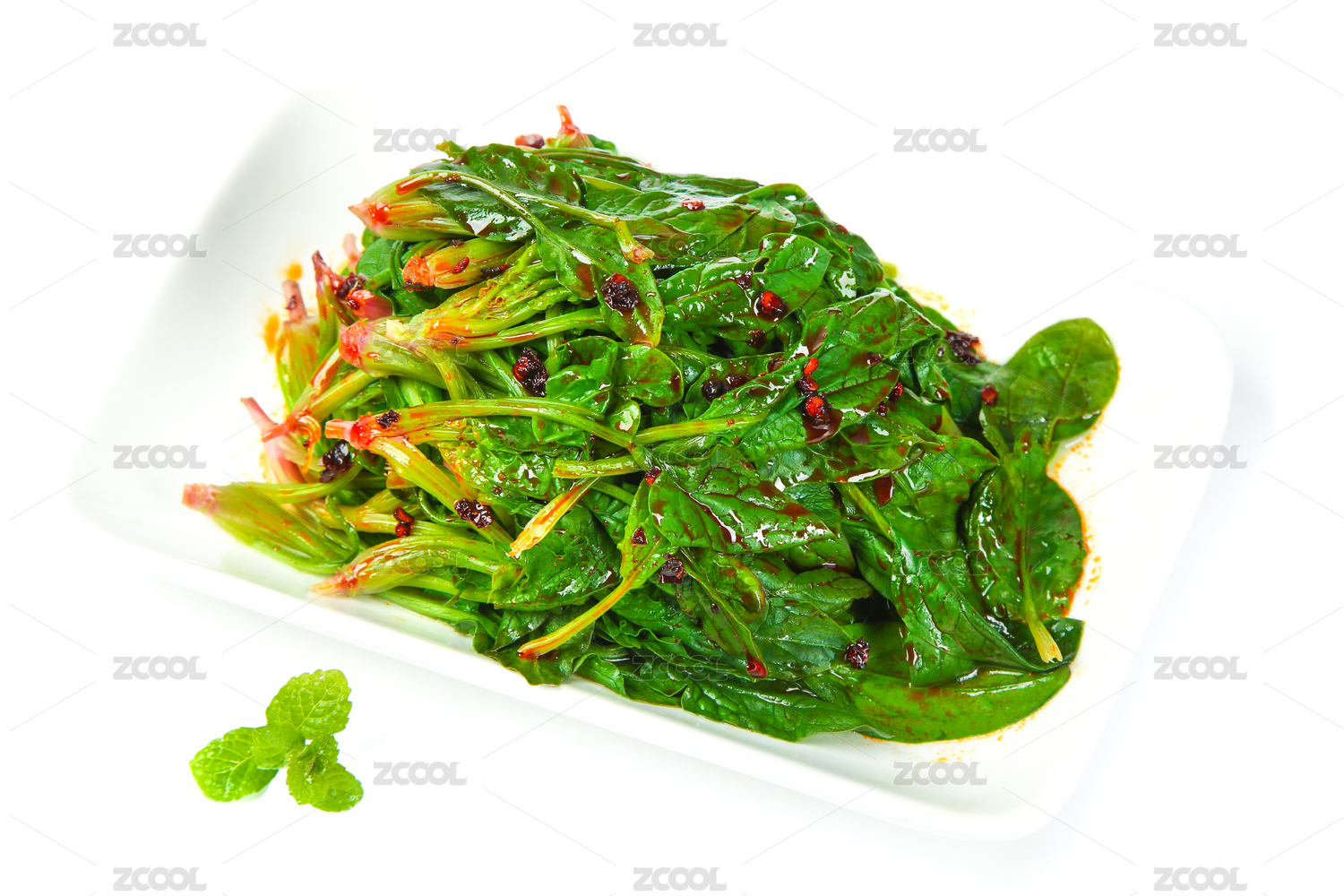 白底上放着一盘香辣菠菜