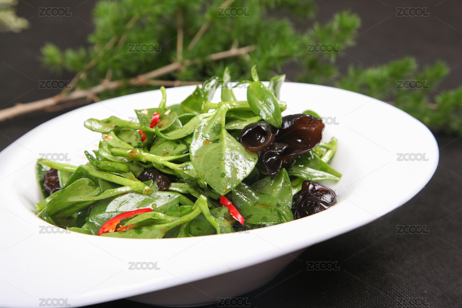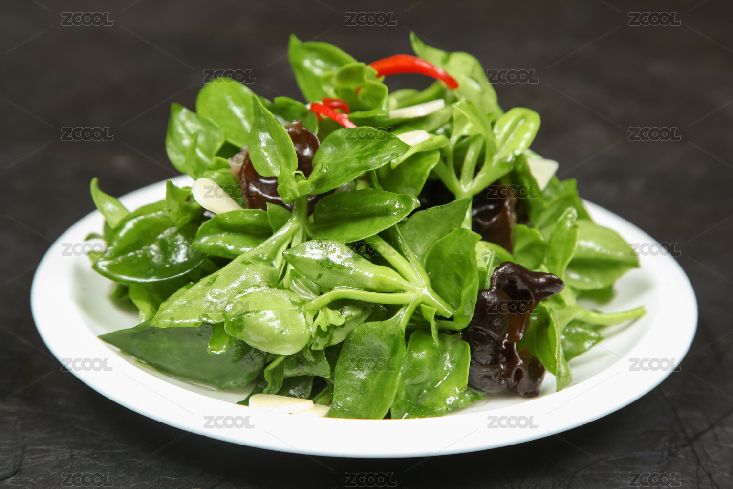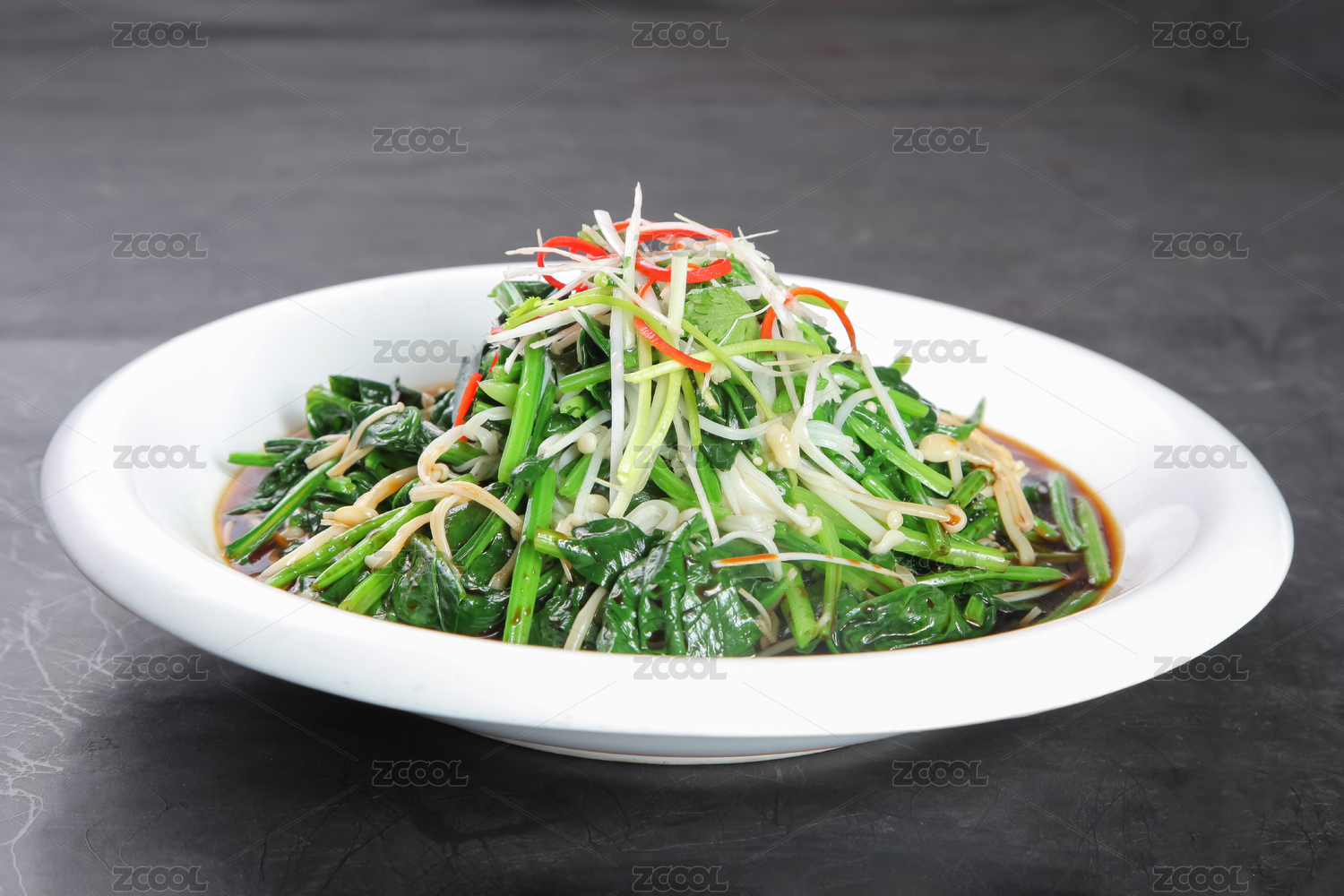 白底上放着一盘香辣菠菜